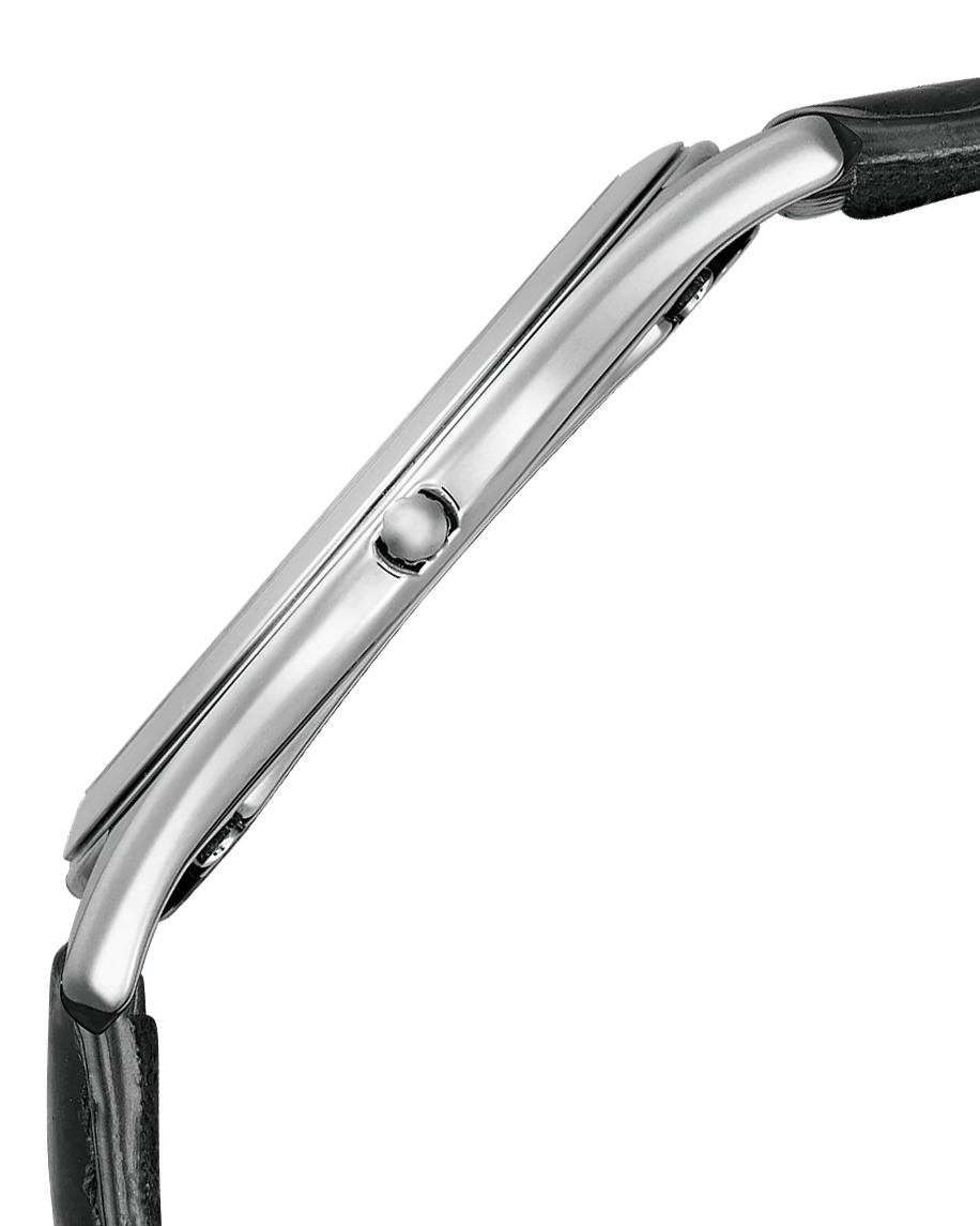 Диаметр корпуса AQ5010-01A составляет 36,6 мм, что вполне умеренно и подходит для официальных случаев. Часы имеют ярко-белый циферблат, золотистую стрелку и черный малый секундный циферблат, который придает циферблату многослойность. Кольцо глав обрамлено черным, что придает циферблату сильный контраст без потери разборчивости. Все это сочетается с глянцевым черным кожаным ремешком, украшенным крокодиловым узором.