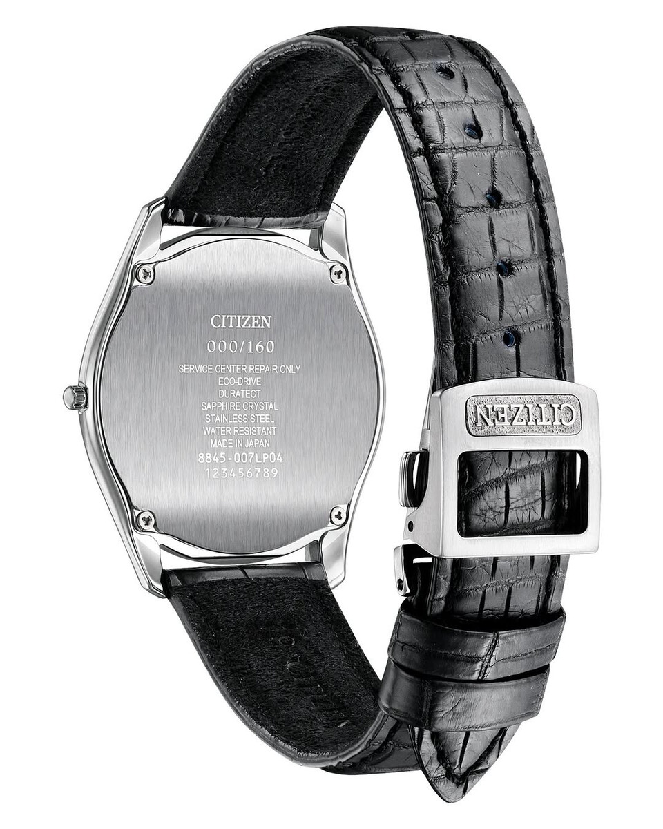 Сзади часы четко заявляют о своей принадлежности: на матовой задней крышке выбито "000/160", что указывает на их статус ограниченной серии. Часы работают на механизме Citizen 8845 Eco-Driveкоторый питает часы от окружающего света и не требует замены батарейки. Упрочнение Duratect, устойчивое к царапинам сапфировое стекло и японская сборка дополняют список характеристик премиум-класса.