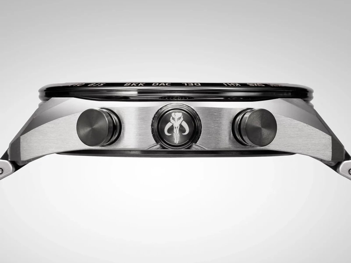 Общий дизайн выглядит относительно сдержанным. На текстурированном черном циферблате расположены три дополнительных циферблата и серебристые накладные индексы, а большинство отсылок к Мандалориану скрыты в деталях. На заводной головке выгравирована эмблема мифозавра, а на задней крышке часов выгравирован текст "The Mandalorian", а также его легендарный шлем.