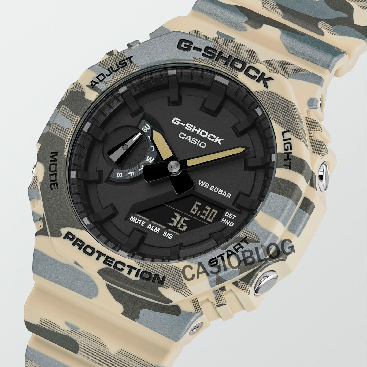 Как Вы можете видеть на прилагаемых изображениях, Casio в значительной степени склоняется к тактической эстетике: обе модели имеют инвертированные (негативные) дисплеи, а ремешки и ободки украшены военными камуфляжными узорами. Модель GA-2100CM-8A выполнена в сиренево-тауповом, серо-тяжелом камуфляже, а модель GA-2100CM-5A выбрала песочно-бежевый камуфляж, вдохновленный пустыней. По данным Casioblog, точечные узоры, которые появляются рядом с камуфляжными полосами, нанесены с помощью технологии лазерной покраски для создания 3D-эффекта.