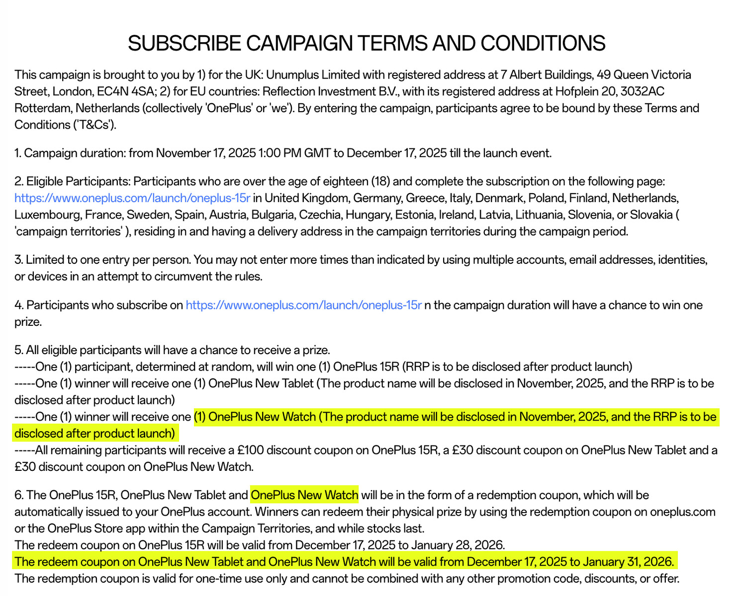 Помимо этих устройств, OnePlus готовится выпустить новые смарт-часы к праздничному сезону. В настоящее время компания лишь подтвердила, что "новые часы OnePlus" "скоро появятся". Хотя название устройства пока остается неизвестным, условия последней рекламной кампании компании подтверждают, что она раскроет название продукта OnePlus New Watch позже в этом месяце.