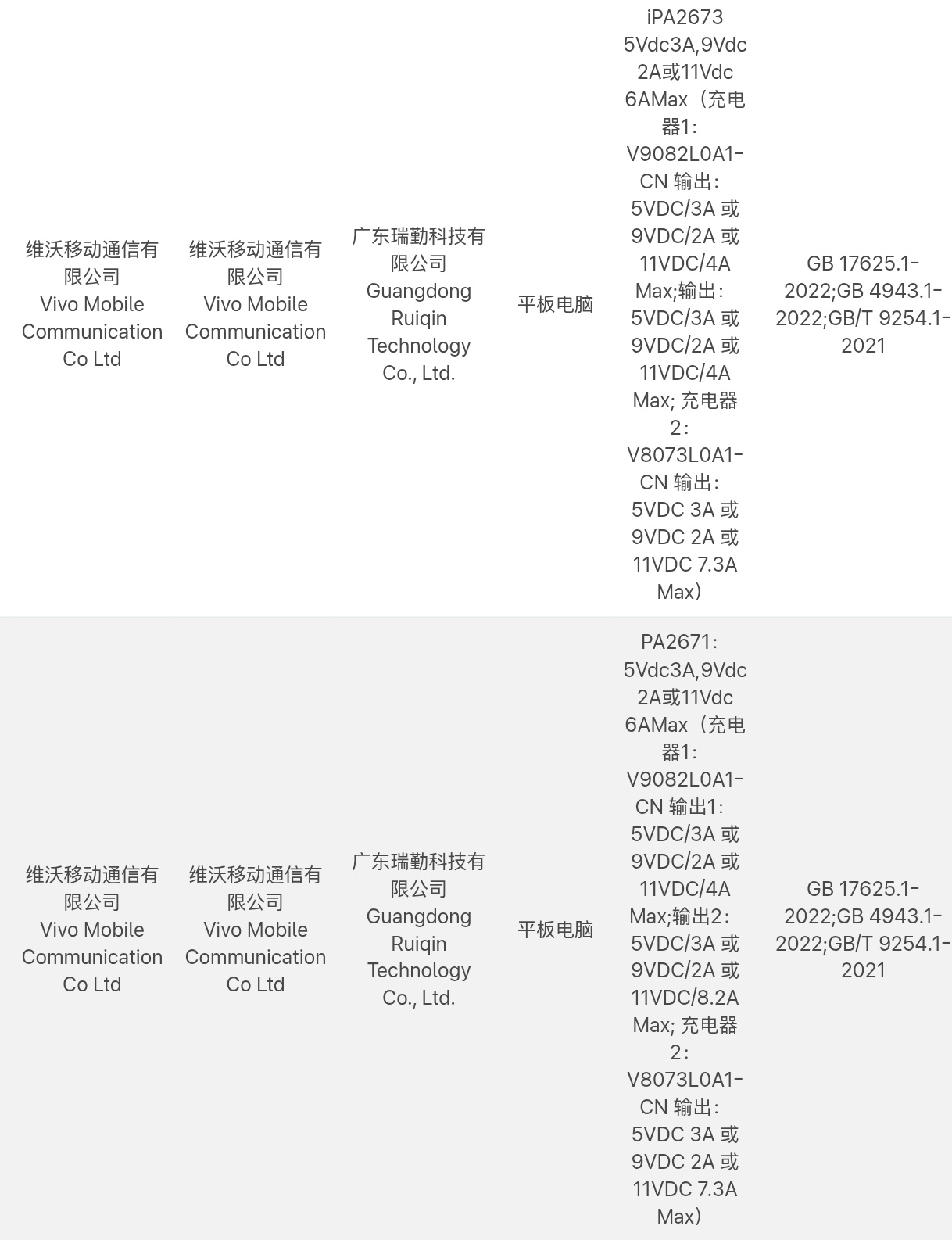 В частности, компания разрабатывает iPA2673 и PA2671, как показано на скриншоте ниже. Согласно данным, предоставленным CCC, оба планшета поддерживают чуть более 80 Вт проводной зарядки при 7,3 А/11 В. Исходя только из этой мощности зарядки, Digital Chat Station сделала вывод, что iPA2673 и PA2671 - это номера моделей iQOO Pad6 Pro и Vivo Pad6 Pro.