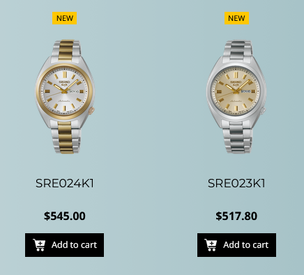 Согласно новым объявлениям, цены на модели SRE021K1 (темно-морской циферблат) и SRE023K1 (циферблат цвета шампанского) составляют SG$517.80 (~$399), а двухцветный вариант SRE024K1 немного выше - SG$545.00 (~$420). В каждой модели используется автоматический механизм 2R06 с 40-часовым запасом хода, поддержкой ручного завода и функцией "стоп-секунда". Механизм скрывается за прозрачной задней крышкой.