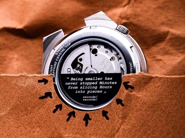 Выставочная задняя крышка также показана в деталях. Автоматический калибр 8210 виден под уникальной надписью, которая гласит: "Быть меньше никогда не мешало Minutes разрезать Часы на кусочки" Часы имеют сапфировое стекло, водонепроницаемость 5 бар и конструкцию из нержавеющей стали.