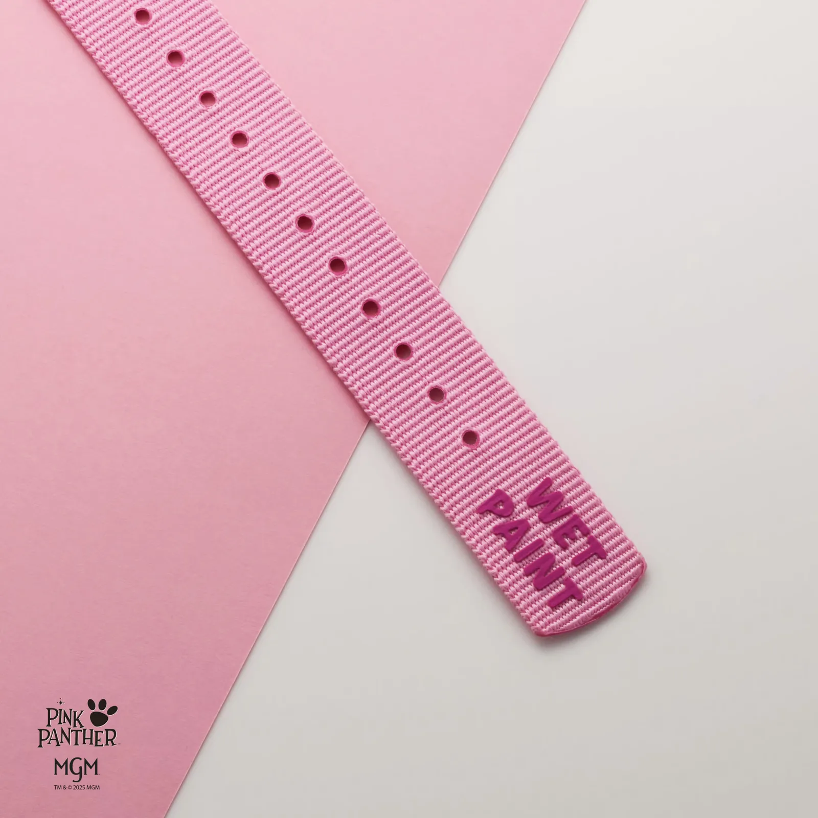 Сразу же бросается в глаза циферблат. Он насыщенного розового цвета с отпечатками лап Розовой Пантеры, вдавленными в поверхность. Секундная стрелка также розовая, а на вставке безеля розовые минутные метки сочетаются с черным кольцом, чтобы сохранить некоторый контраст. В положении "три часа" расположено окошко с датой, а стрелка соответствует стандартному дизайну 5 Sports. На задней крышке розовое выставочное окно показывает глаза Пантеры и логотип персонажа, напечатанный на стекле.