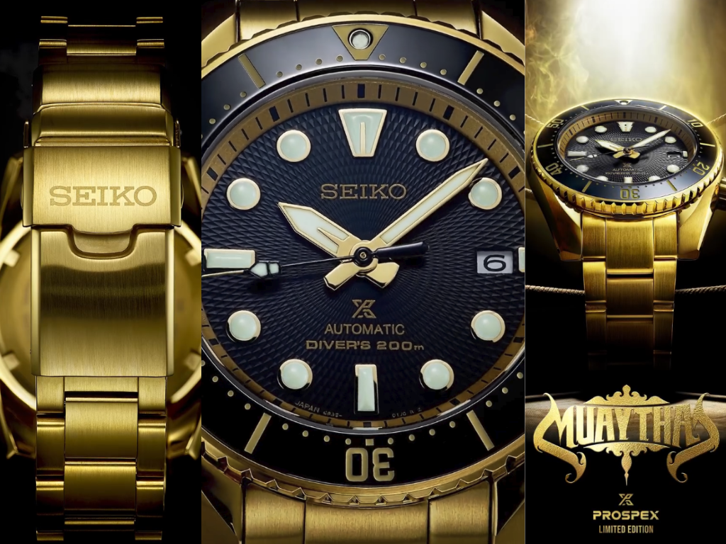 Seiko Таиланд полностью представил лимитированную серию Prospex Muay Thai, о которой он рассказывал ранее ранее дразнилаи в итоге часы оказались смелым полностью золотым дайвером с черным текстурированным циферблатом и соответствующим золотым браслетом.