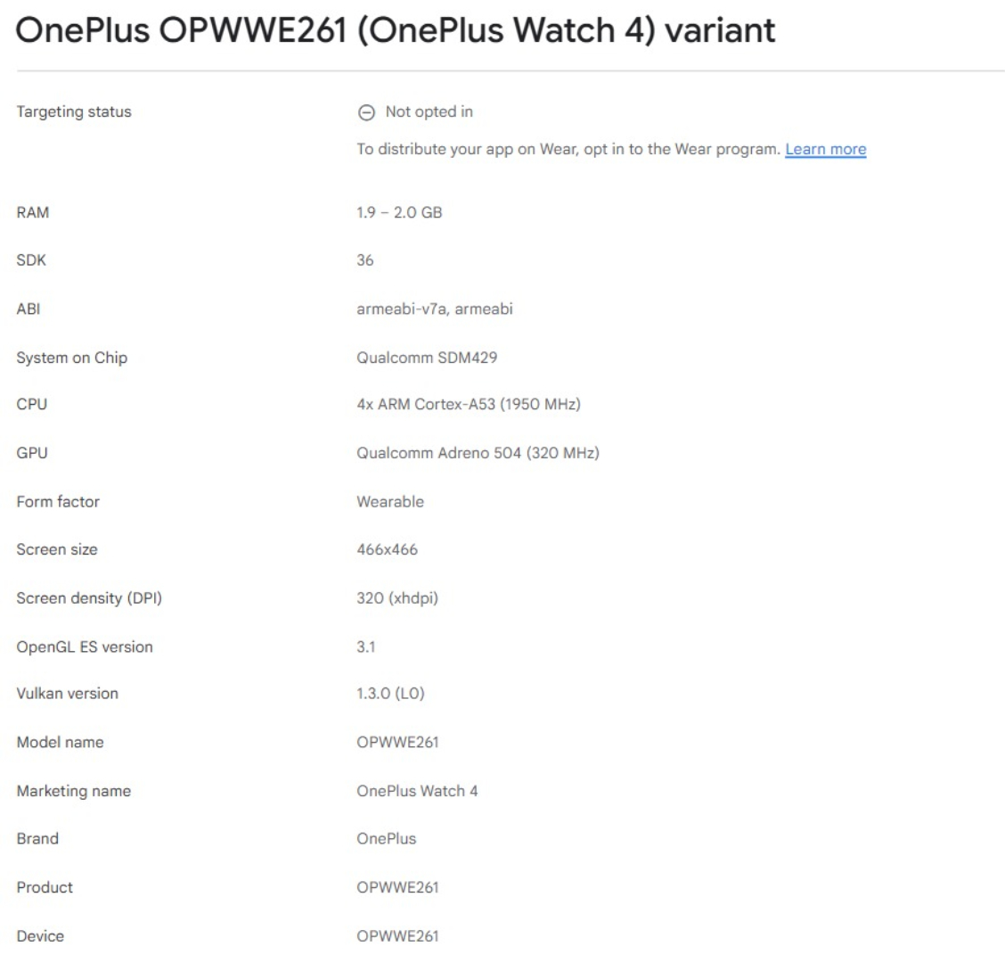 К сожалению, предыдущие предположения о том, что OnePlus перенесла аппаратное обеспечение со старшей модели старшей модели Watch 3(текущая цена $249,99 на Amazon) оказались верными. Например, в Google Play Console указано, что Watch 4 сочетают в себе 2 Гб оперативной памяти и процессор Qualcomm Snapdragon W5 Gen 1 а не более новым чипсетом Snapdragon Wear Elite.