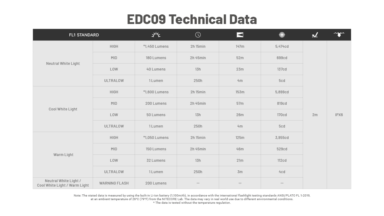 Фонарь имеет класс защиты IPX6, длину чуть более 10 см и весит 114 грамм, включая аккумулятор. Аккумулятор не заменяется и заряжается через USB-C, что позволяет использовать фонарь во время зарядки. Время автономной работы составляет 2 часа 15 минут в самом ярком режиме и 250 часов в самом тусклом режиме, независимо от цвета света. Однако дальность и яркость зависят от цвета света. Данные можно найти в таблице производителя ниже.
