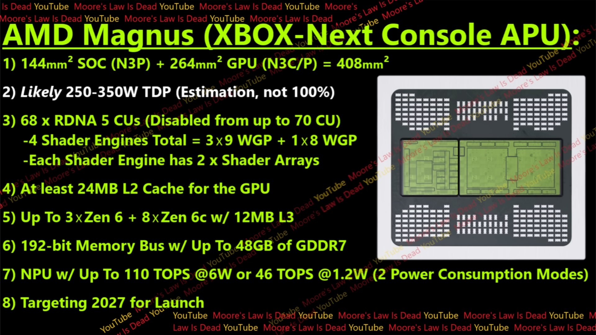 Его GPU будет производиться на узле N3P или N3C компании TSMC, а SoC - на TSMC N3P. Что касается процессора, то он будет оснащен 11-ядерным CPU с тремя ядрами Zen 6 и восемью ядрами Zen 6c. Том утверждает, что эта цифра является предварительной и что некоторые из них могут быть отключены. Наконец, Xbox Magnus также будет оснащена NPU для задач искусственного интеллекта на устройстве.