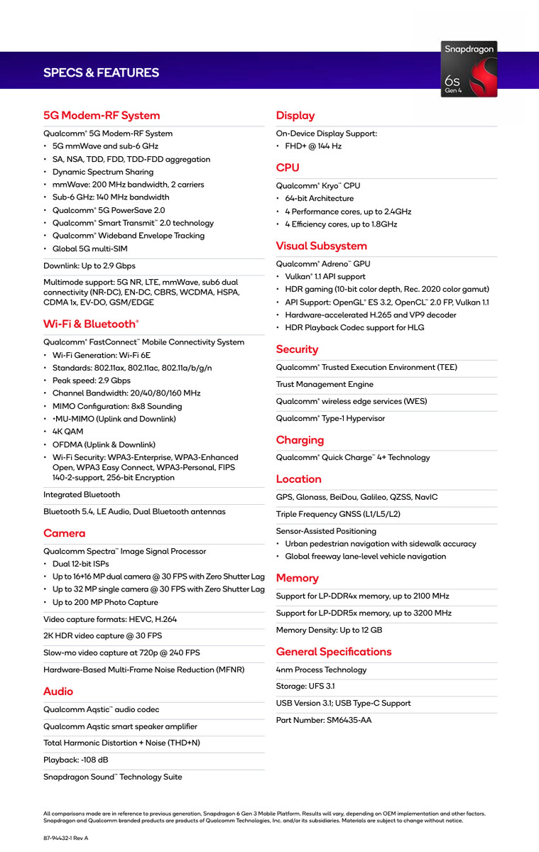 Логично, что сравнение будет проводиться с Snapdragon 6s Gen 3 который Snapdragon 6s Gen 4 должен прийти на смену. Однако номер детали "SM6435-AA" указывает на то, что Snapdragon 6s Gen 4 является родственником Snapdragon 6 Gen 1 (SM6450), который используется во многих смартфонах, таких как Honor Magic 7 Lite и Moto G Stylus 5G 2024 (по цене 199 долларов на Amazon).