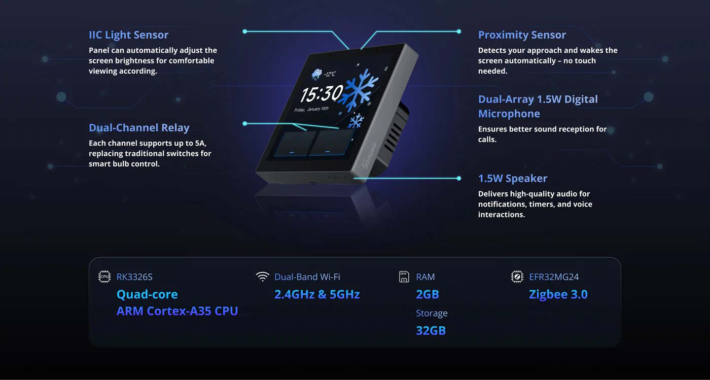 Оборудование включает два микрофона для голосовых команд. SoC RK3326-S работает в паре с 2 Гб оперативной памяти и 32 Гб внутренней памяти. 3,95-дюймовый дисплей имеет разрешение 480 × 480 пикселей и является сенсорным. Его яркость можно регулировать с помощью датчика яркости, поэтому он остается легко читаемым днем и не отвлекает ночью. NSPanel Pro Gen 2 может определять, когда человек стоит перед устройством. В устройство встроен динамик. Также утверждается, что устройство способно отображать записи с камер наблюдения. В настоящее время эта модель доступна для заказа по цене около 120 долларов США, а поставки ожидаются в июне.