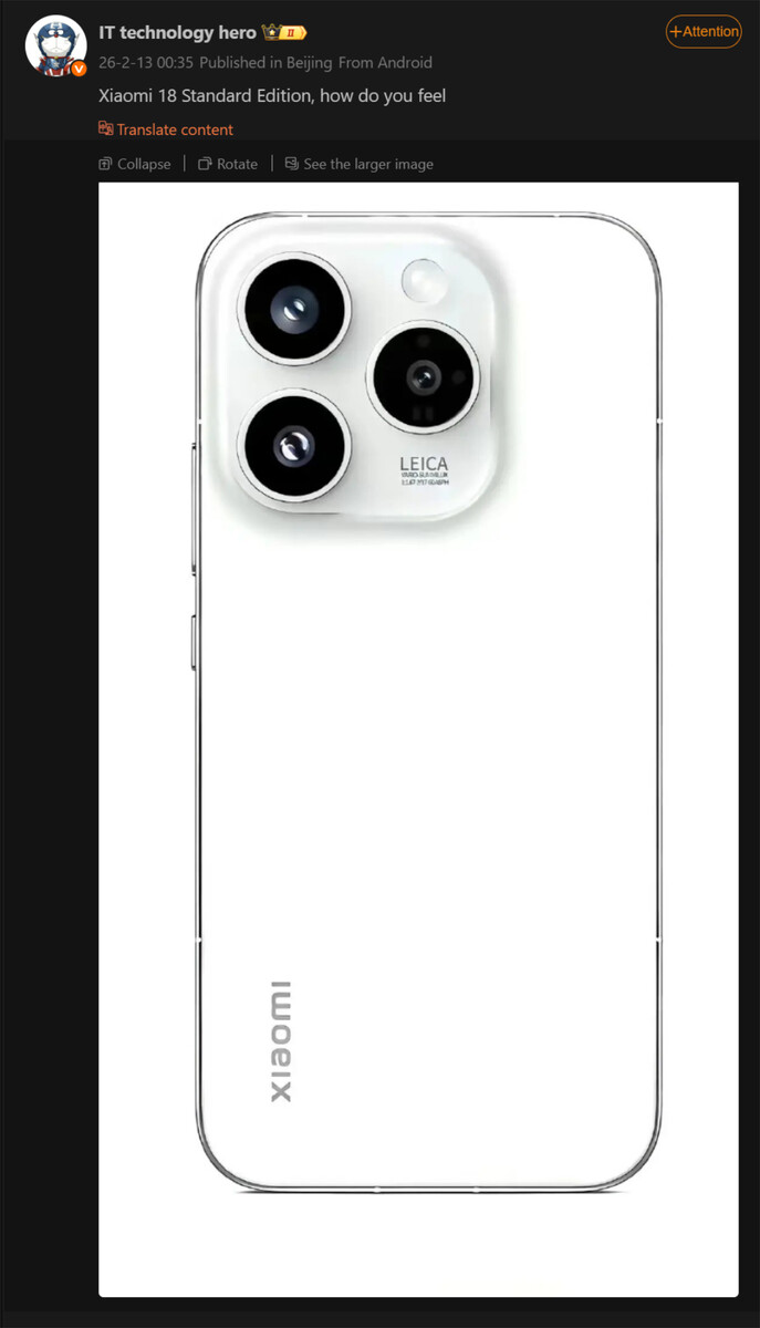 Xiaomi 18 Pro и Xiaomi 18 Pro Max как сообщается тоже претендуют на более мощный Snapdragon 8 Elite Gen 6 Pro. В отличие от них, Xiaomi 18, по слухам, будет единственным из трех, который использует стандартный Snapdragon 8 Elite Gen 6 от Qualcomm. Мало того, новый слух от широко известного пользователя Weibo предполагает, что Xiaomi 18 также будет отличаться от своего предшественника по дизайну, не в последнюю очередь благодаря более крупному дисплею.
