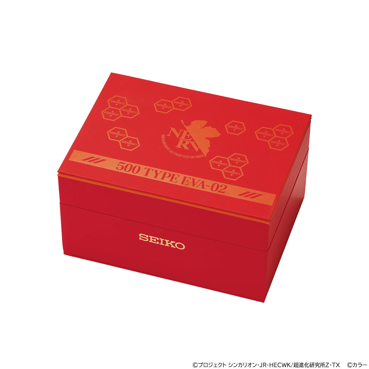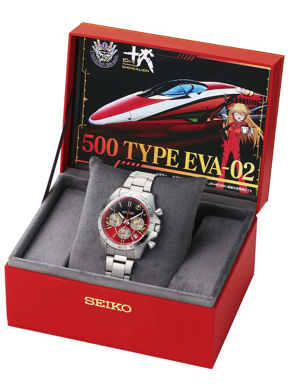 Часы повторяют предыдущие совместные работы Seiko с Evangelion и Shinkalion, но эти часы больше похожи на ливрею поезда 500 Type EVA-02, который курсировал по линии Sanyō Shinkansen в рамках проекта, посвященного юбилею Evangelion в реальном мире. Цветовая схема повторяется почти один в один: красные внешние части, черная середина и металлические акценты, напоминающие детали кабины поезда. Даже маркер "1 час" повторяет круглую оконную раму, использовавшуюся на синкансене с тематикой EVA-02.