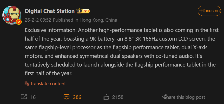 Digital Chat Station, надежный источник информации на Weibo, поделился сообщением о высокопроизводительном игровом планшете, который будет выпущен в H1 (первой половине) 2026 года. Как сообщается, он станет конкурентом готовящегося к выпуску в 2026 году планшета Legion, который Lenovo недавно анонсировала.
