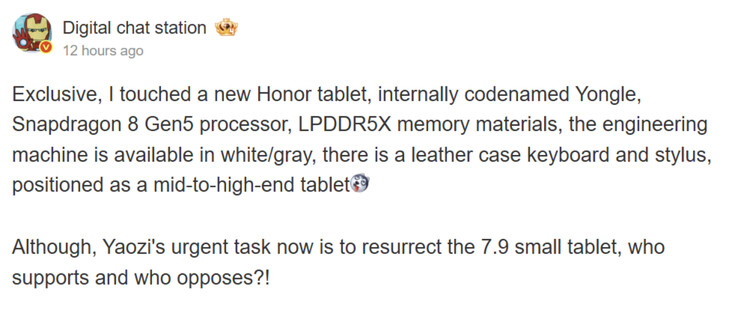 Как видно на скриншоте ниже, Digital Chat Station не называет имя еще не представленного планшета Honor. Вместо этого они ссылаются на его кодовое имя Yongle. Тем не менее, используемый чипсет указывает на то, что "Yongle" заменит MagicPad 3 или Pad GT2 Pro, а не MagicPad 3 Pro. В частности, сообщается, что Honor оснастит "Yongle" следующим чипом Snapdragon 8 Gen 5 который лежит в основе OnePlus 15R (цена $699,99 на Amazon).