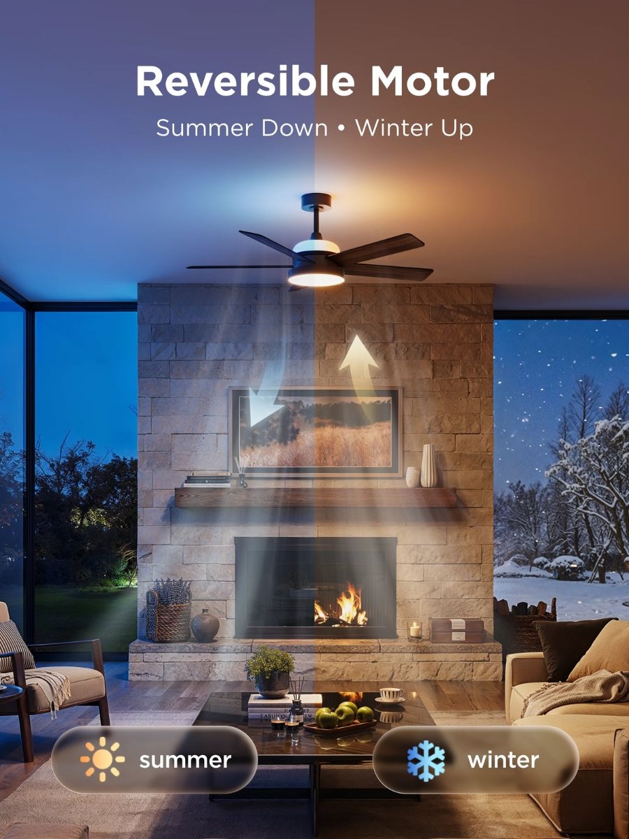 Этот потолочный вентилятор от Govee, как утверждается, быстро охлаждает комнату, обеспечивая воздушный поток до 5 000 футов³/мин (~142 м³/мин). Пользователи могут выбрать одну из шести скоростей, а сам вентилятор работает относительно тихо - его двигатель издает около 30 дБ шума. Кроме того, реверсивный двигатель позволяет вытягивать тепло вверх и циркулировать по комнате зимой.