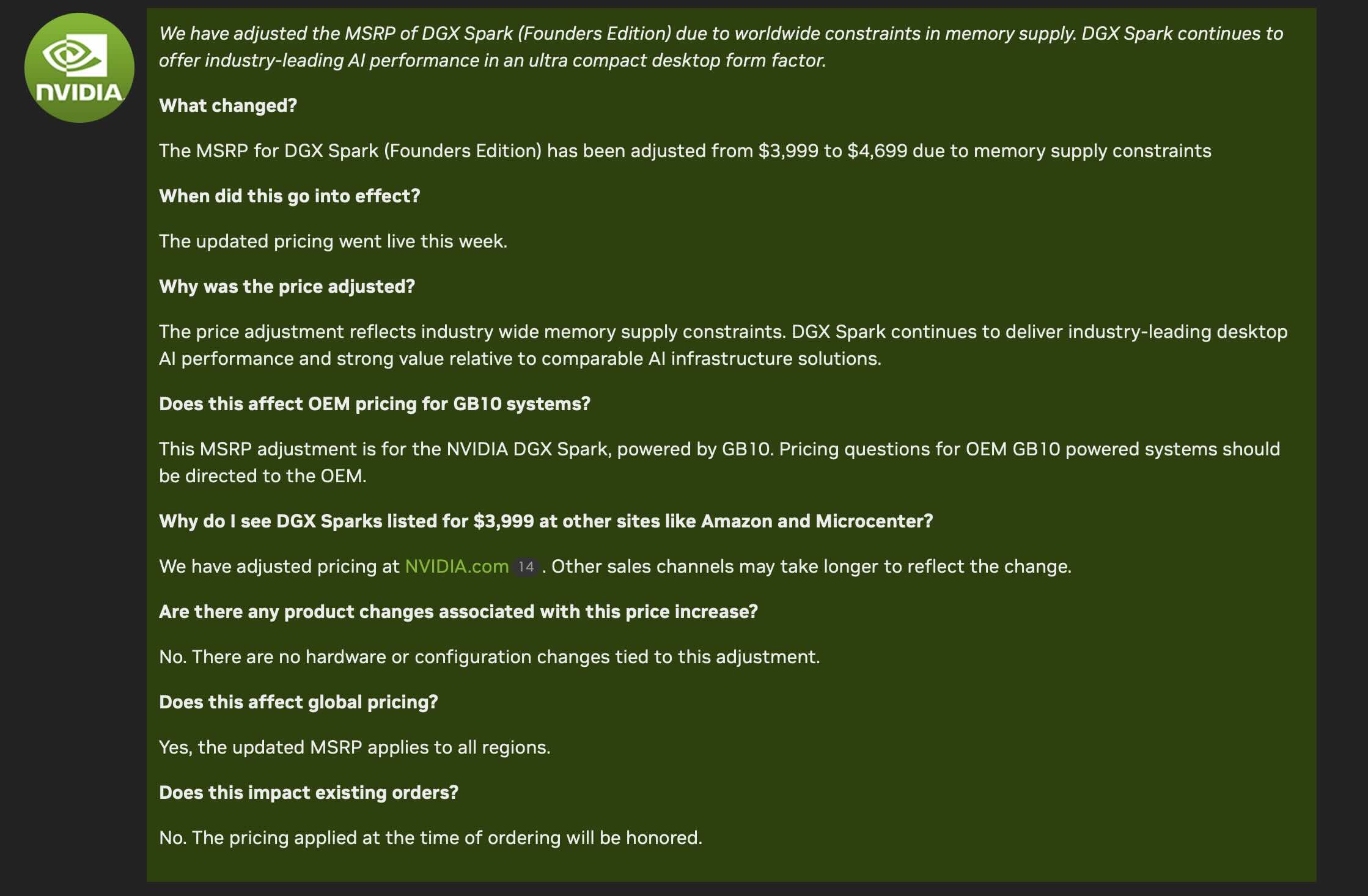Nvidia DGX Spark на базе GB10 со 128 ГБ памяти LPDDR5X подорожает на 700 долларов