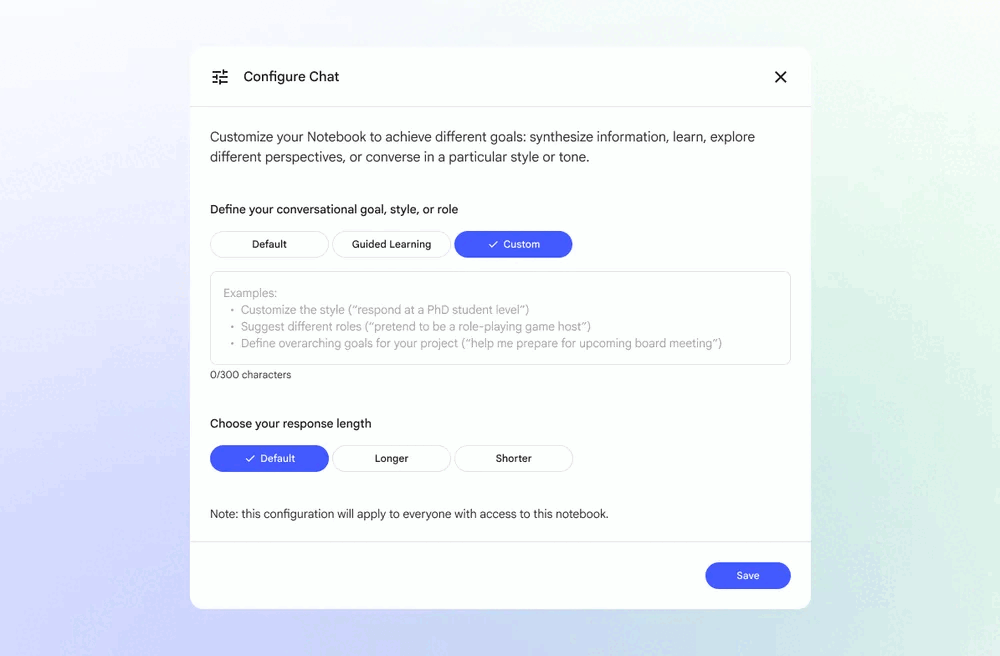 Кроме того, теперь можно определять роли. Например, NotebookLM может вести себя как строгий академический экзаменатор или как творческий мастер игры.