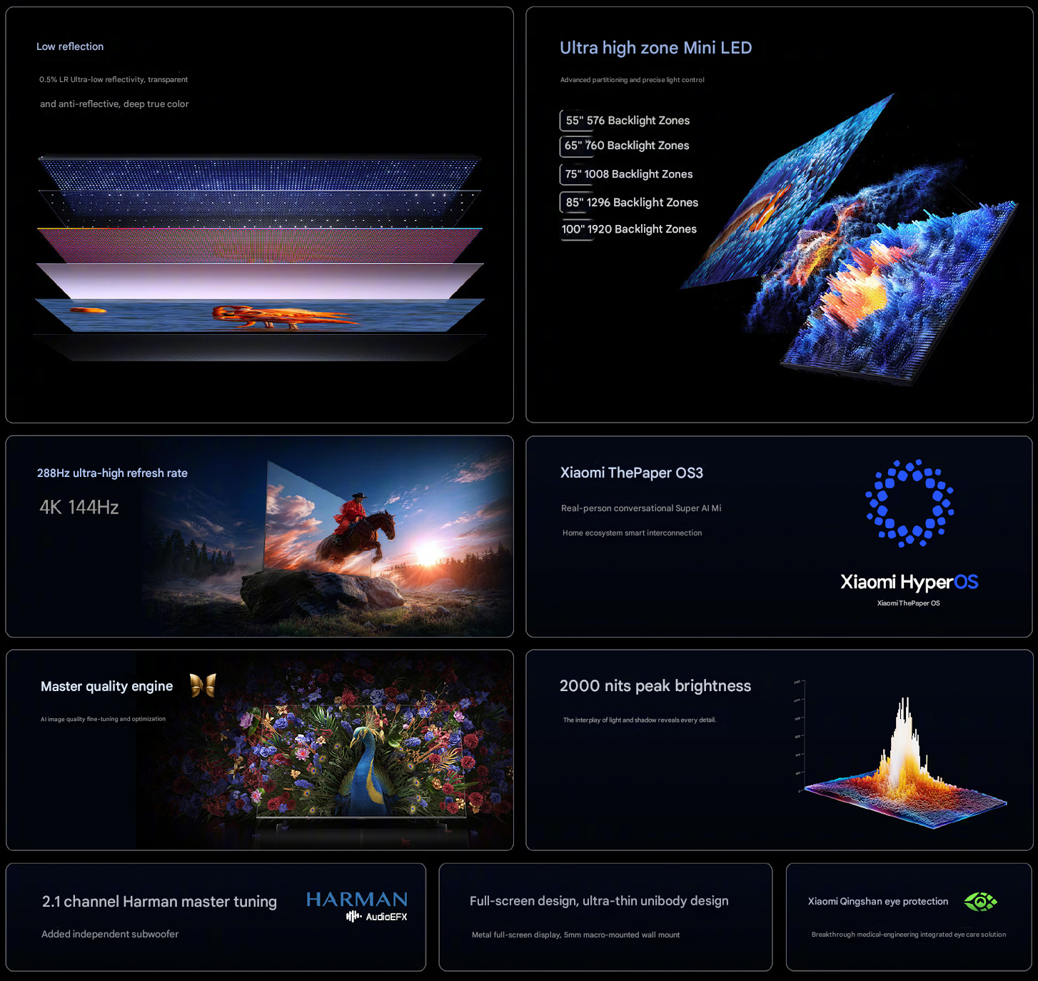 Среди этих пяти моделей базовая модель имеет 55-дюймовую панель, а топовый вариант оснащен 100-дюймовым дисплеем. Последняя линейка которая недавно была официально представлена в ЕС, достигает 98 дюймов, и панели у них тоже не одинаковые. Тем не менее, вот начальные цены на каждую из моделей китайской серии Xiaomi S Mini LED TV 2026: