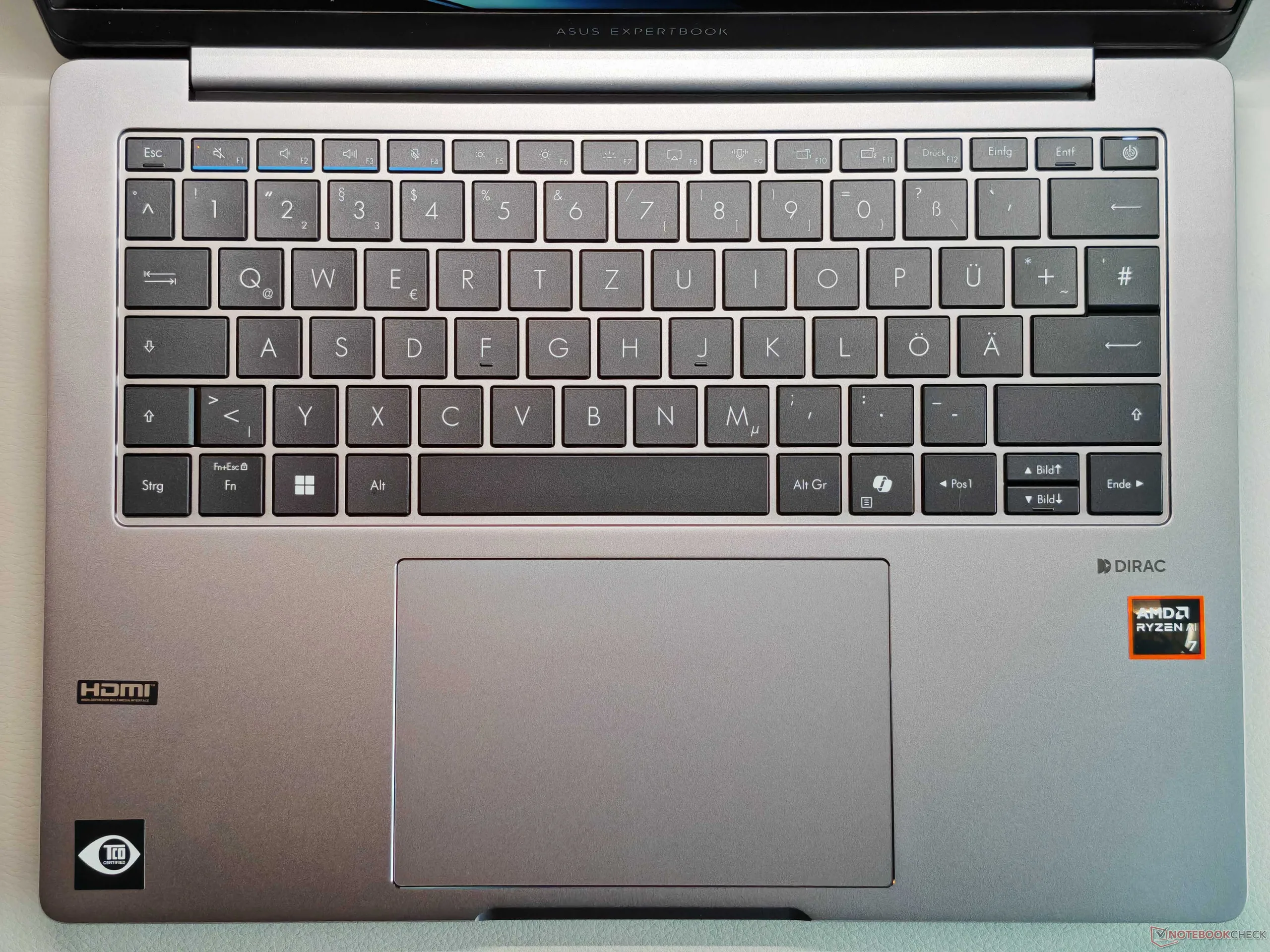 Датчик отпечатков пальцев также встроен в кнопку питания в правом верхнем углу. Тачпад размером 13 x 8,5 см обладает хорошим скольжением и работает без проблем. На нижнюю область можно нажимать механически, и шум при этом не слишком громкий.