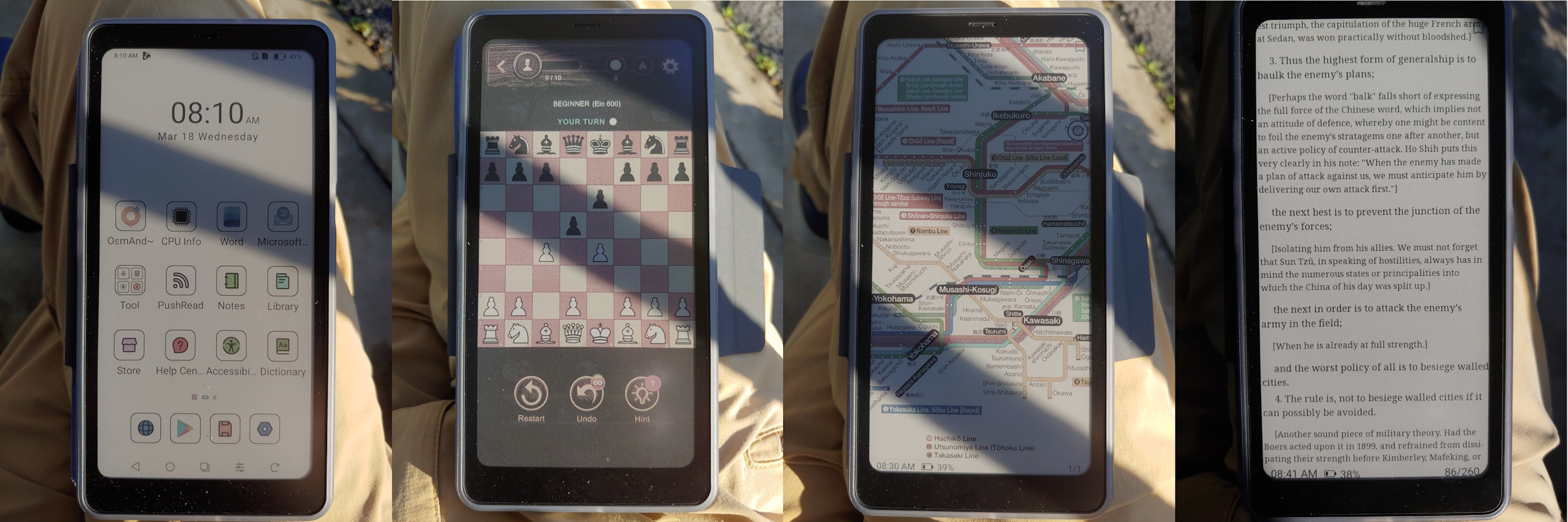 Качество текста и изображения зависит от настроек EinkWise. Матовая панель E Ink отражает свет, как бумага, и остается полностью видимой под любым углом при дневном свете или при включенной подсветке.