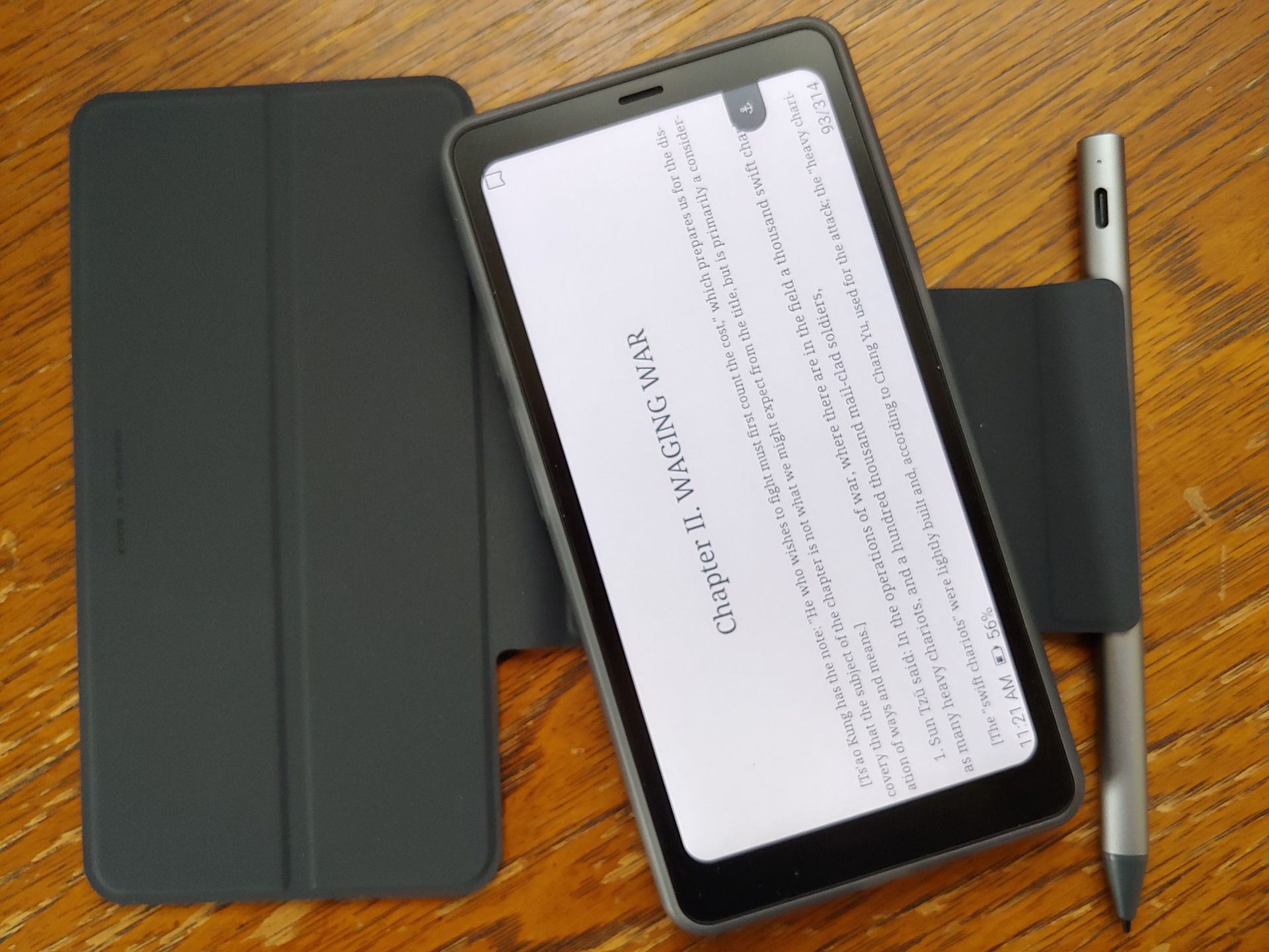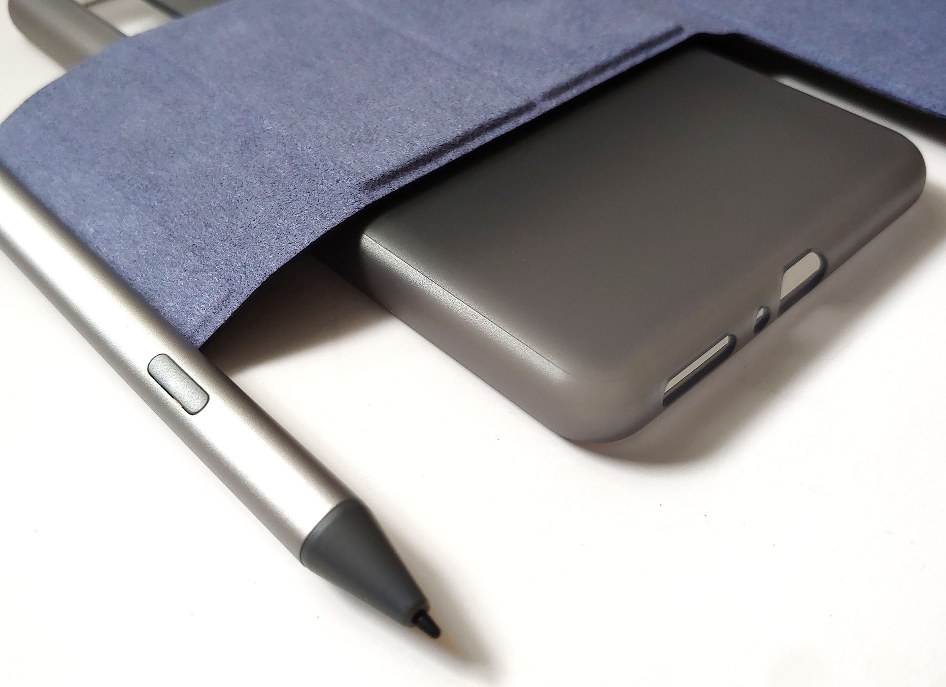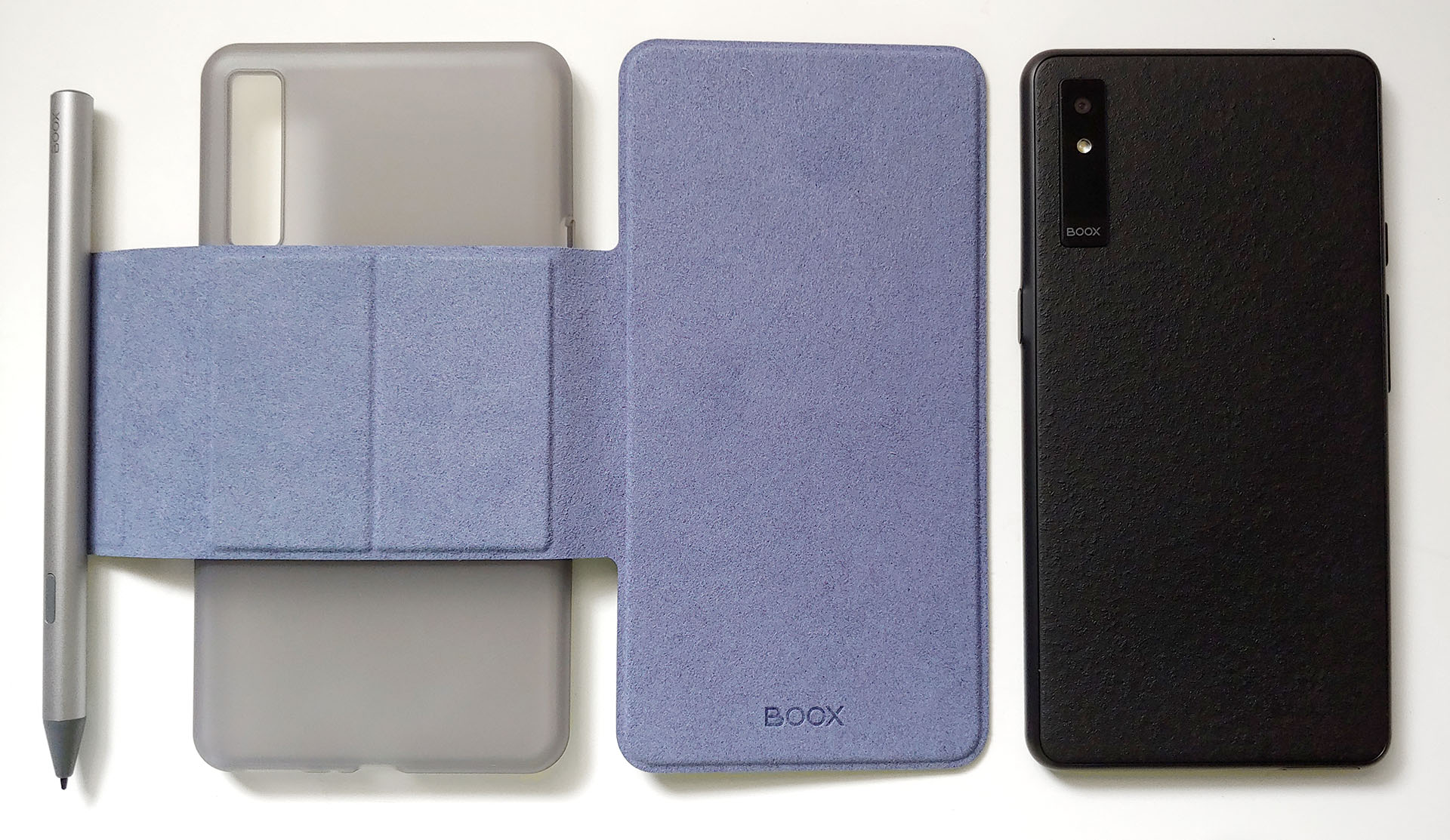 Электронная читалка работает с магнитным стилусом и чехлом. Стилус прикрепляется к голой задней части Boox или к крышке чехла. Boox помещается в пластиковый корпус, а затем магнитом прикрепляется к крышке, которую также можно довольно легко отсоединить.