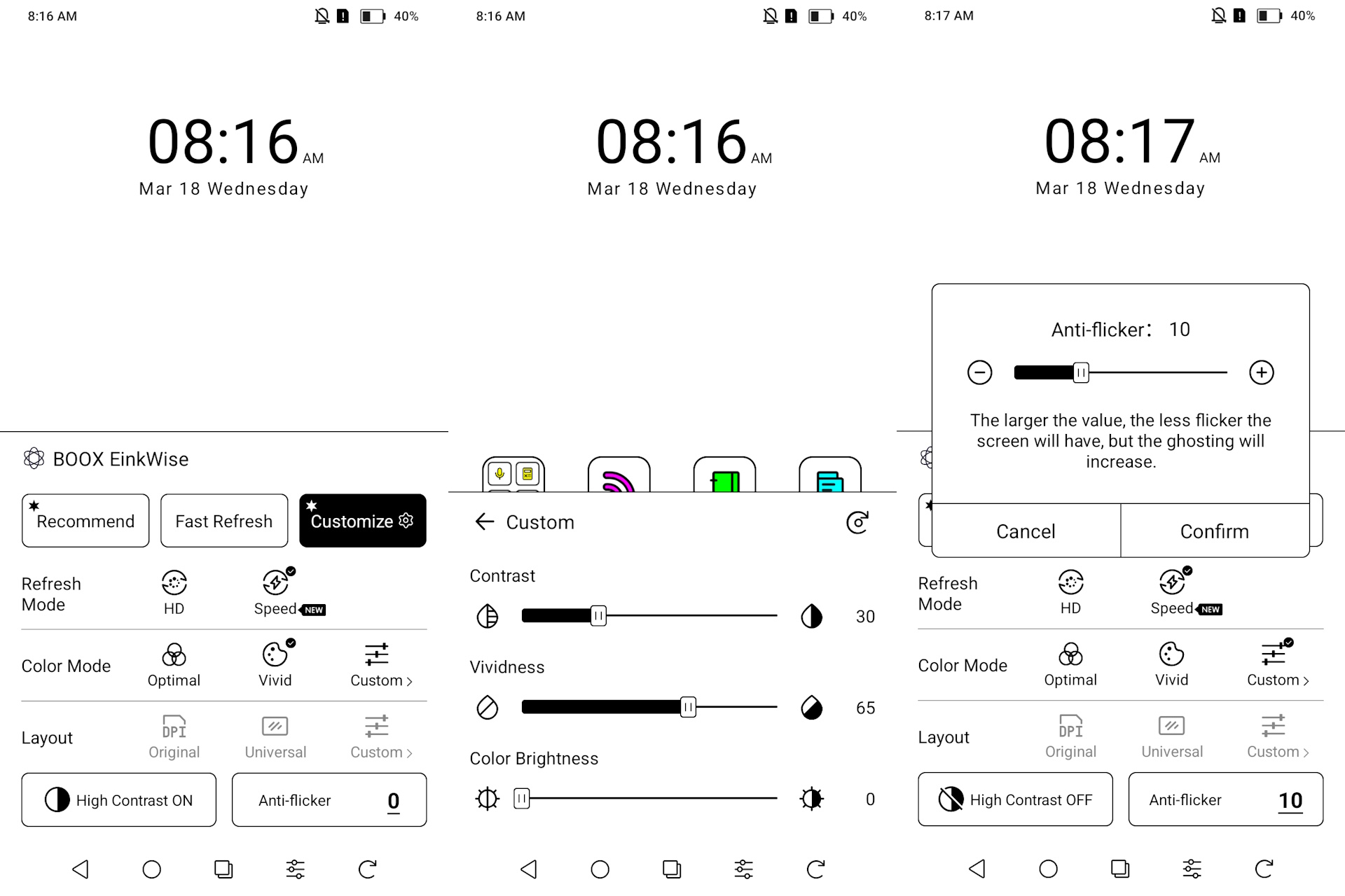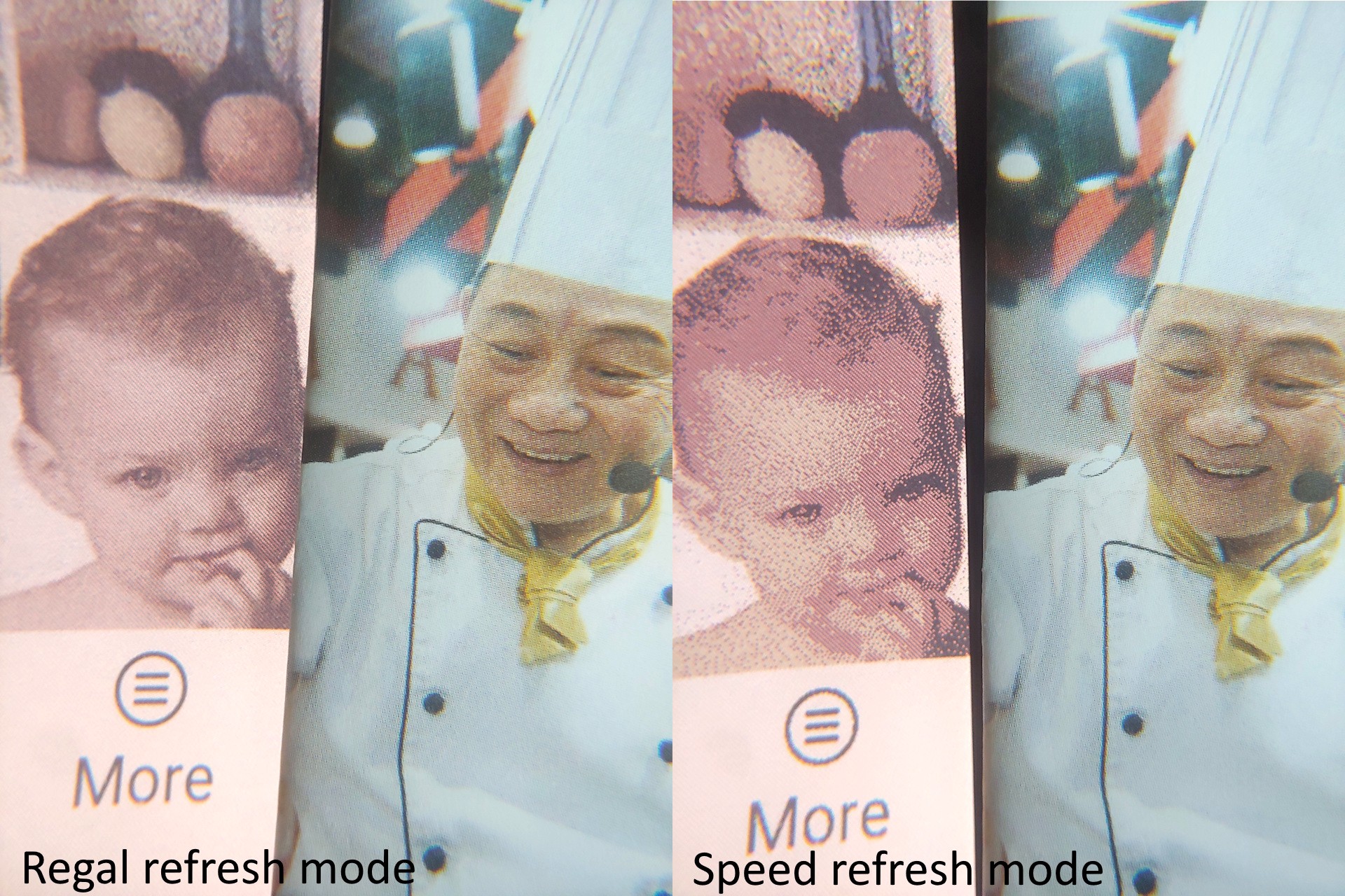 Режим Speed refresh обеспечивает быструю прокрутку, но снижает качество изображения, а режимы Regal и HD повышают четкость ценой более медленного взаимодействия и случайных инвертированных вспышек. Качество приближается к газетному в более высоких режимах и становится заметно грубее в режиме Speed.