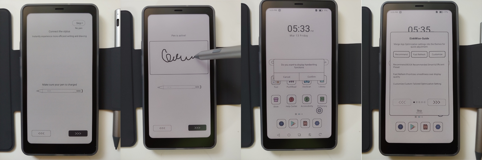 Установка была быстрой, с подсказками о языке, времени, графическом интерфейсе, настройке пера и EinkWise прежде чем попасть на главный экран. Учетная запись Google не требуется, хотя AI Assistant требует учетной записи Onyx.