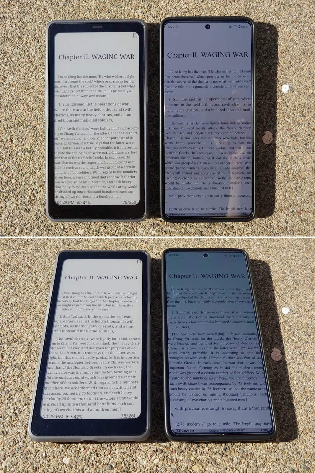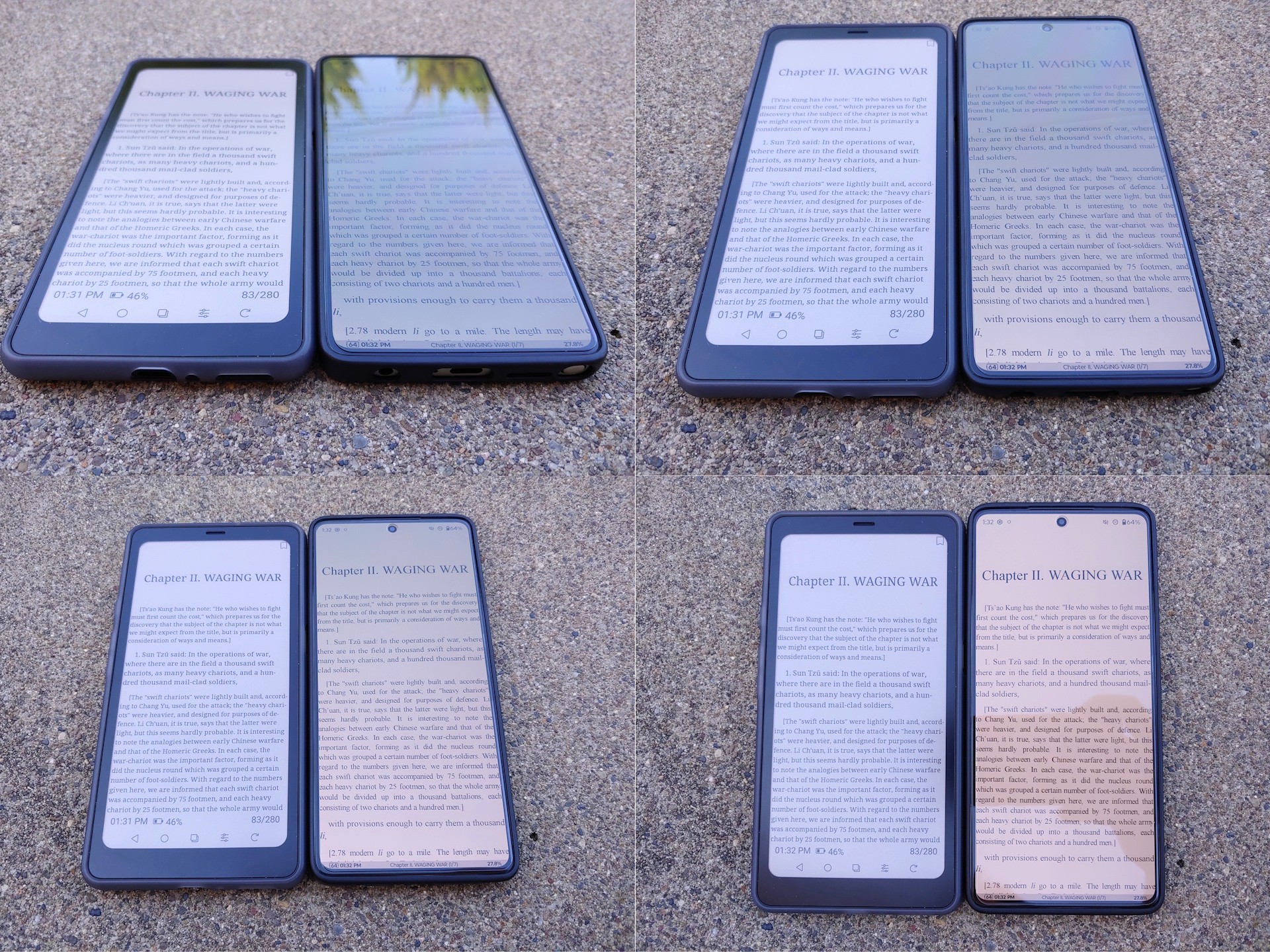 На прямом солнце дисплей Kaleido 3 гораздо лучше читается, чем Moto G Stylus 2024 OLED при максимальной автоматической яркости 1 200 нит. В тени оба дисплея кажутся одинаково яркими, когда Moto установлен на ~550 нит в ручном режиме. Панель E Ink также остается читаемой под любым углом без отражений и цветовых сдвигов, свойственных OLED.