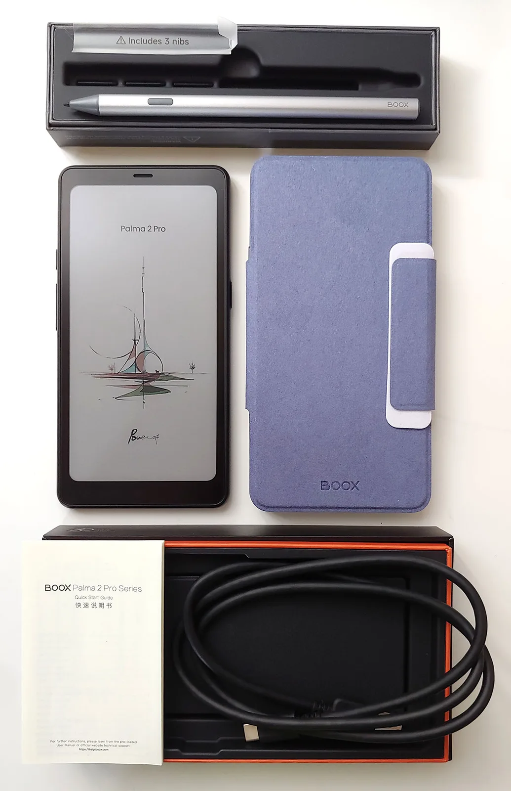 В комплект поставки электронной читалки входит кабель USB-C, краткое руководство по эксплуатации, инструмент для извлечения SIM-карты, а также дополнительный магнитный чехол и стилус с тремя сменными наконечниками.