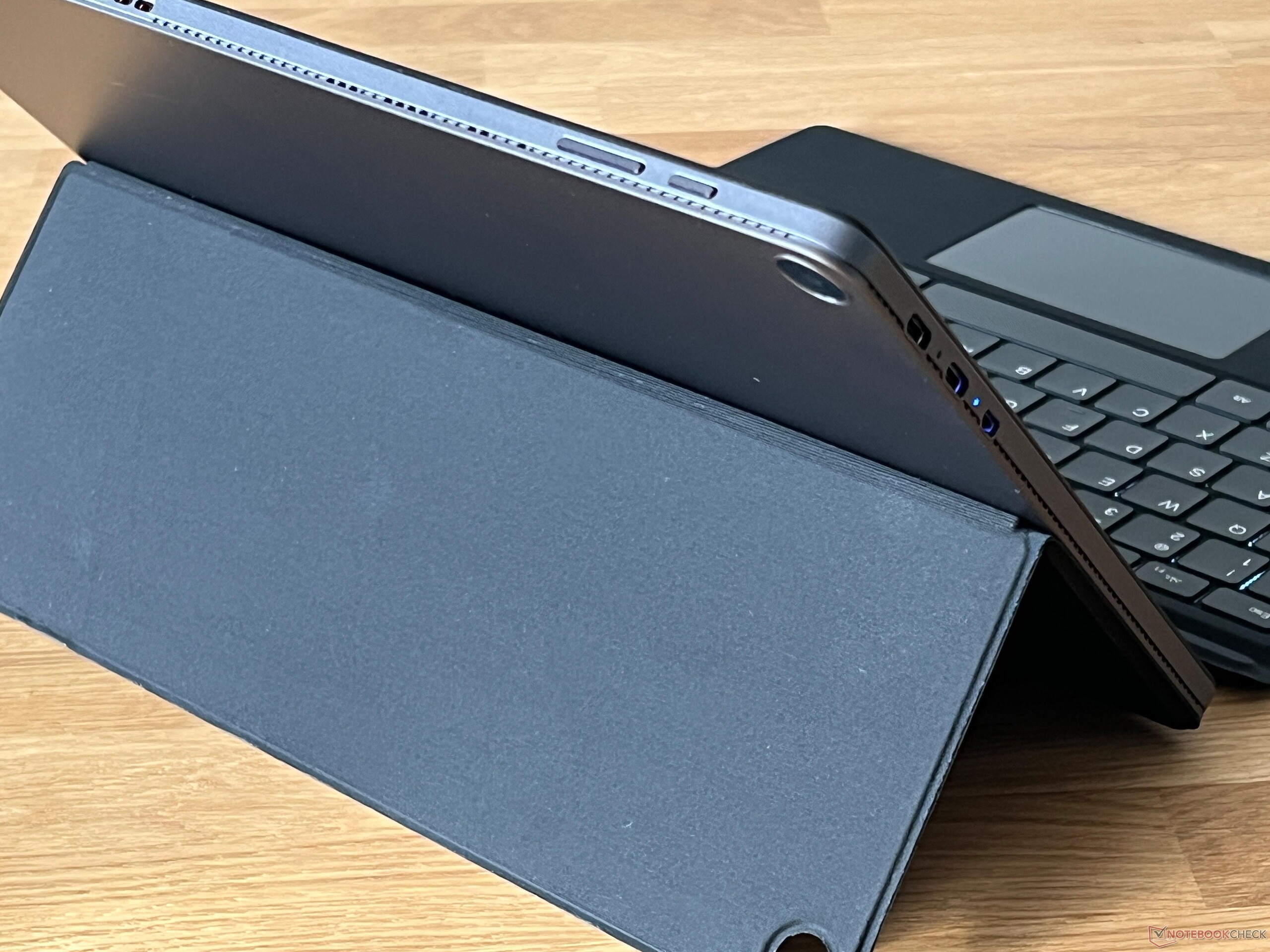 Hi10 Max - это планшет без встроенной подставки для ног. Chuwi использует металлическую конструкцию, и темно-серый корпус кажется высококачественным, хотя при повороте устройства слышны легкие скрипы. Экран также может быть заметно вдавлен с небольшим усилием, но это не оказывает негативного влияния на функциональность. Обычные сенсорные нажатия не вызывают таких проблем. В комплект поставки входит задняя крышка с вырезом для камеры, нижняя половина которой крепится к корпусу на магнитах. Верхнюю часть можно откинуть, чтобы она служила подставкой, что хорошо работает на практике и обеспечивает дополнительную защиту. Дополнительная крышка-клавиатура крепится к нижней части, но соединение не особенно прочное и имеет тенденцию быстро отклеиваться.