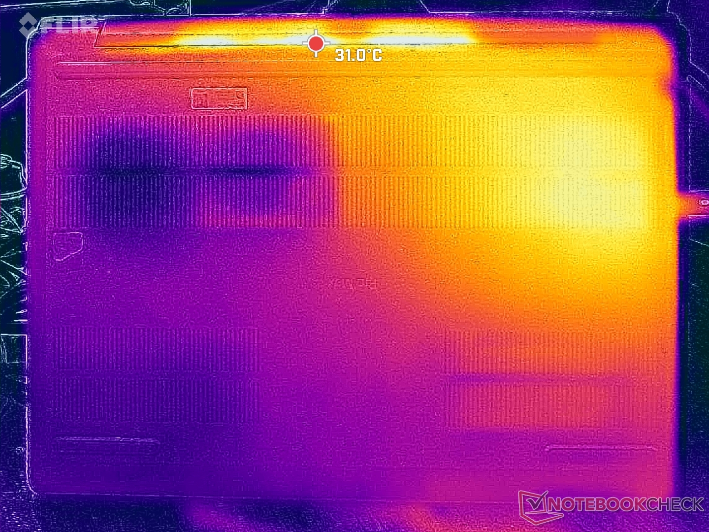 (±) 3: The average temperature for the upper side is 34.2 °C / 94 F, compared to the average of 32 °C / 90 F for the class Workstation.