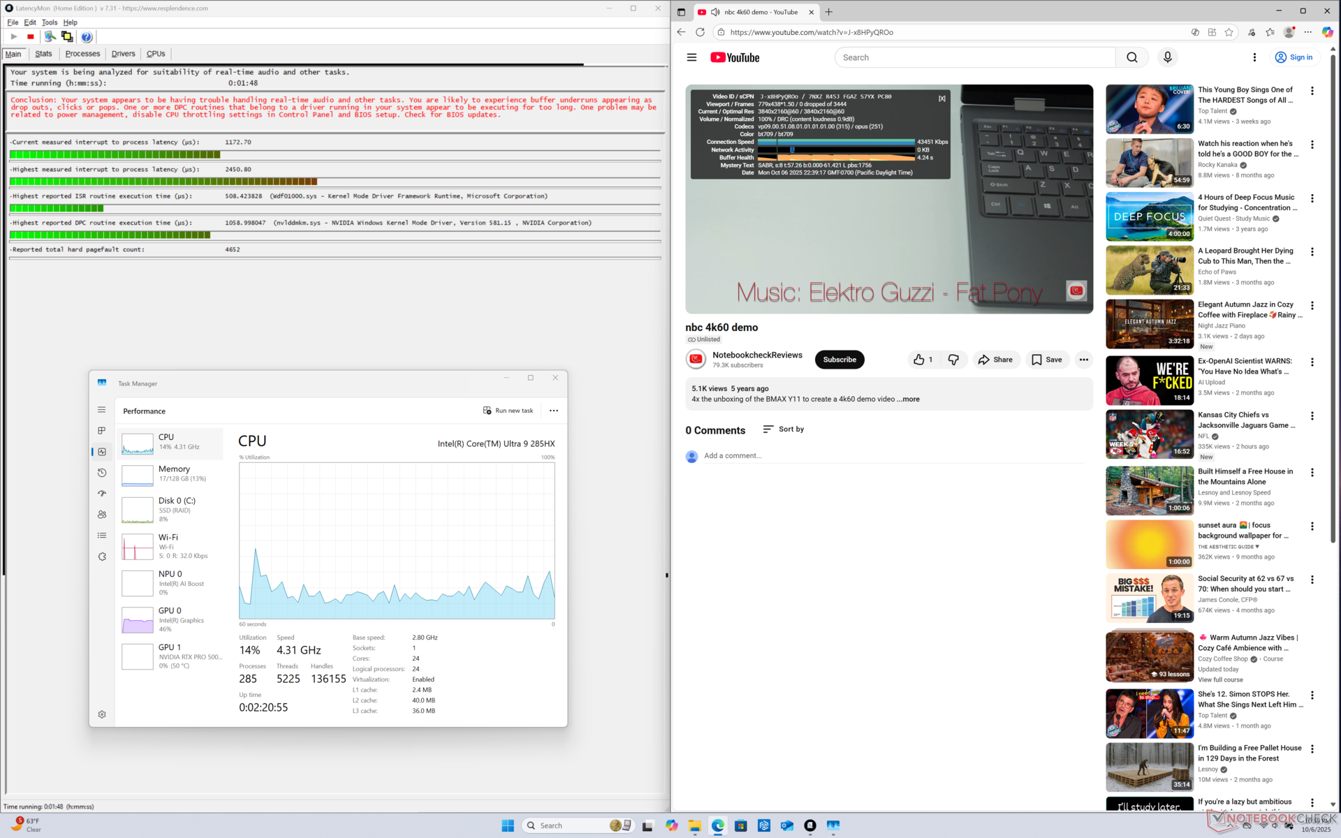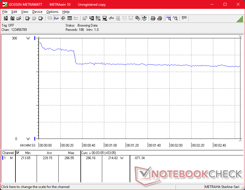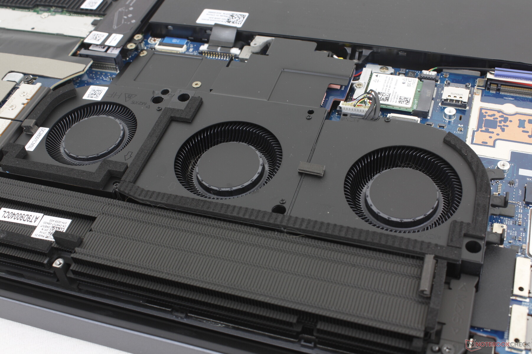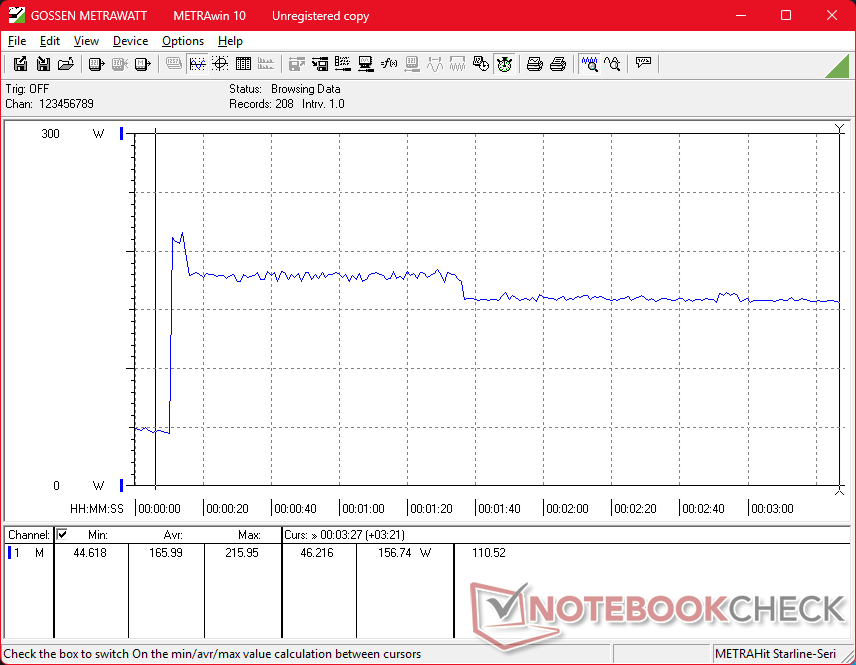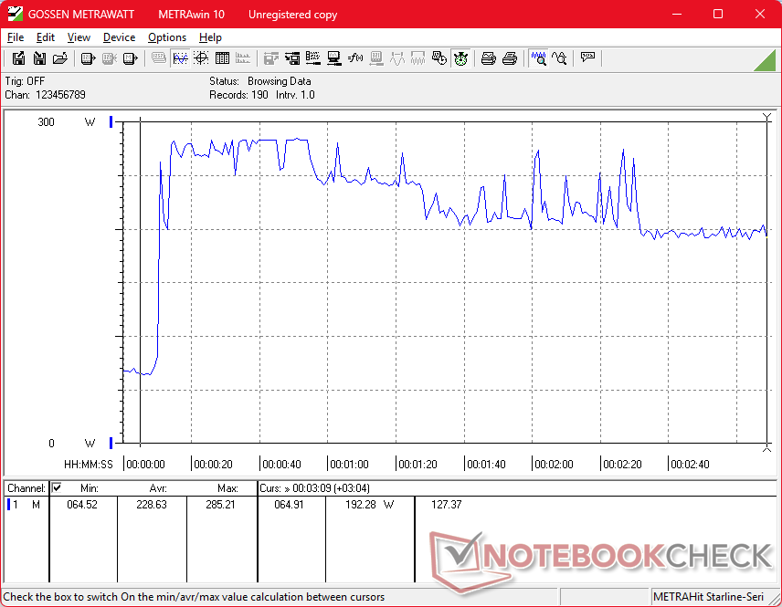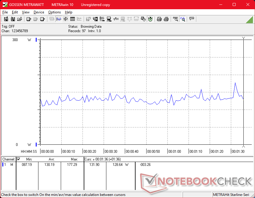 Недостатки в целом незначительны. Потребляемая мощность теперь выше, чем раньше - до 280 Вт по сравнению с 240 Вт или меньше у Precision 7680. Таким образом, хотя Pro Max 16 Plus, безусловно, мощнее, он также более требователен к системе охлаждения, что в целом сокращает время автономной работы. Температура CPU, в частности, при нагрузке может достигать 95-105 C, что влияет на производительность Turbo Boost. В то же время, GPU имеет тенденцию стабилизироваться на уровне 125 Вт, хотя он рассчитан на мощность до 175 Вт. Поэтому вполне вероятно, что те же CPU и GPU могут работать быстрее в более толстых или больших форм-факторах, таких как 18-дюймовый Pro Max 18 Plus. Тем не менее, система Pro Max 16 Plus является одной из самых быстрых и практичных рабочих станций, несмотря на любые ограничения, связанные с охлаждением.