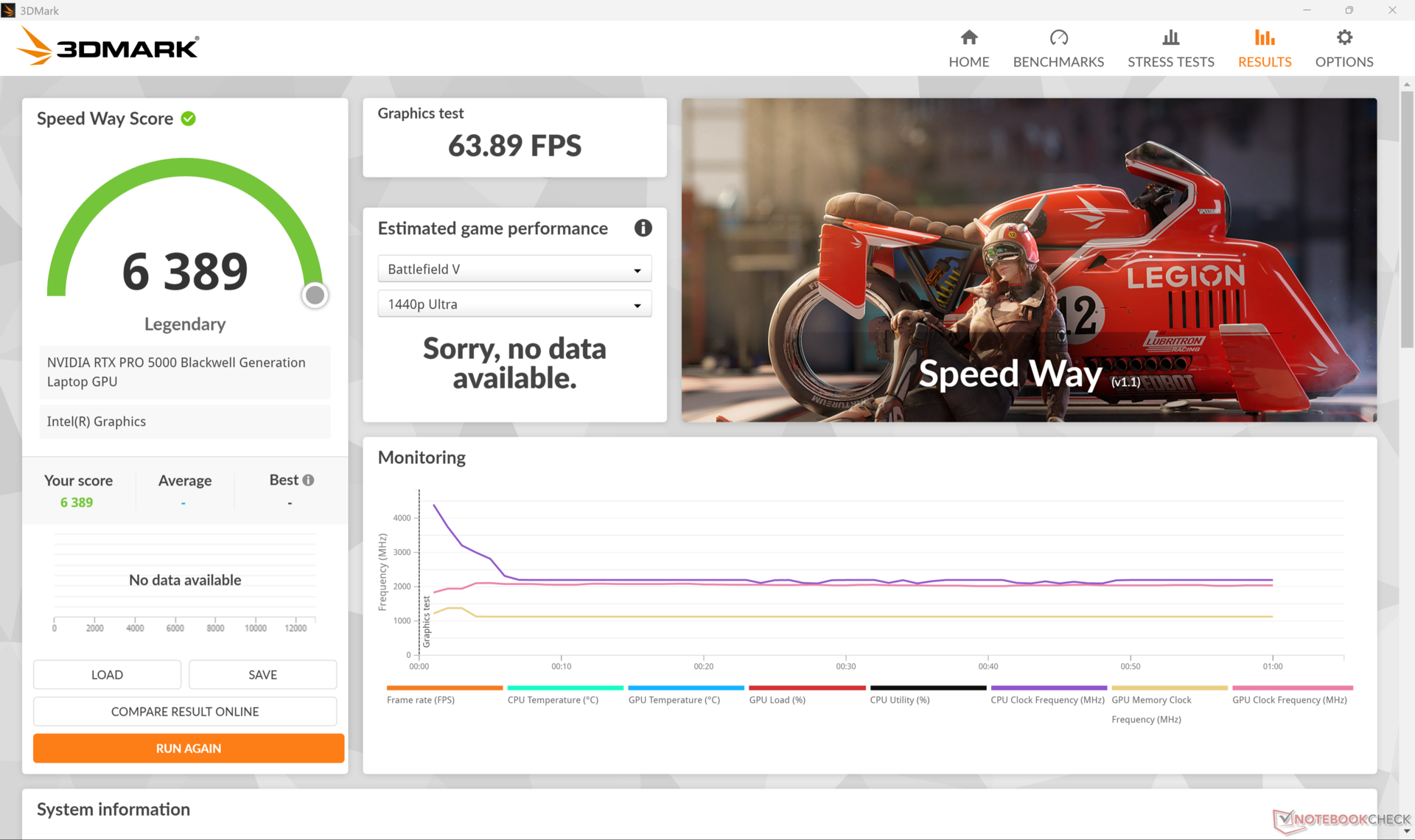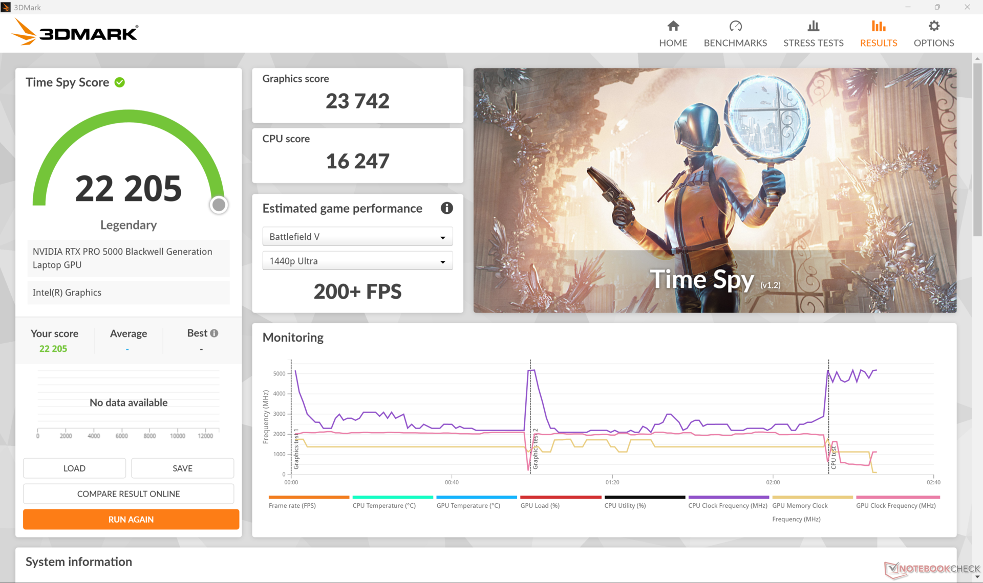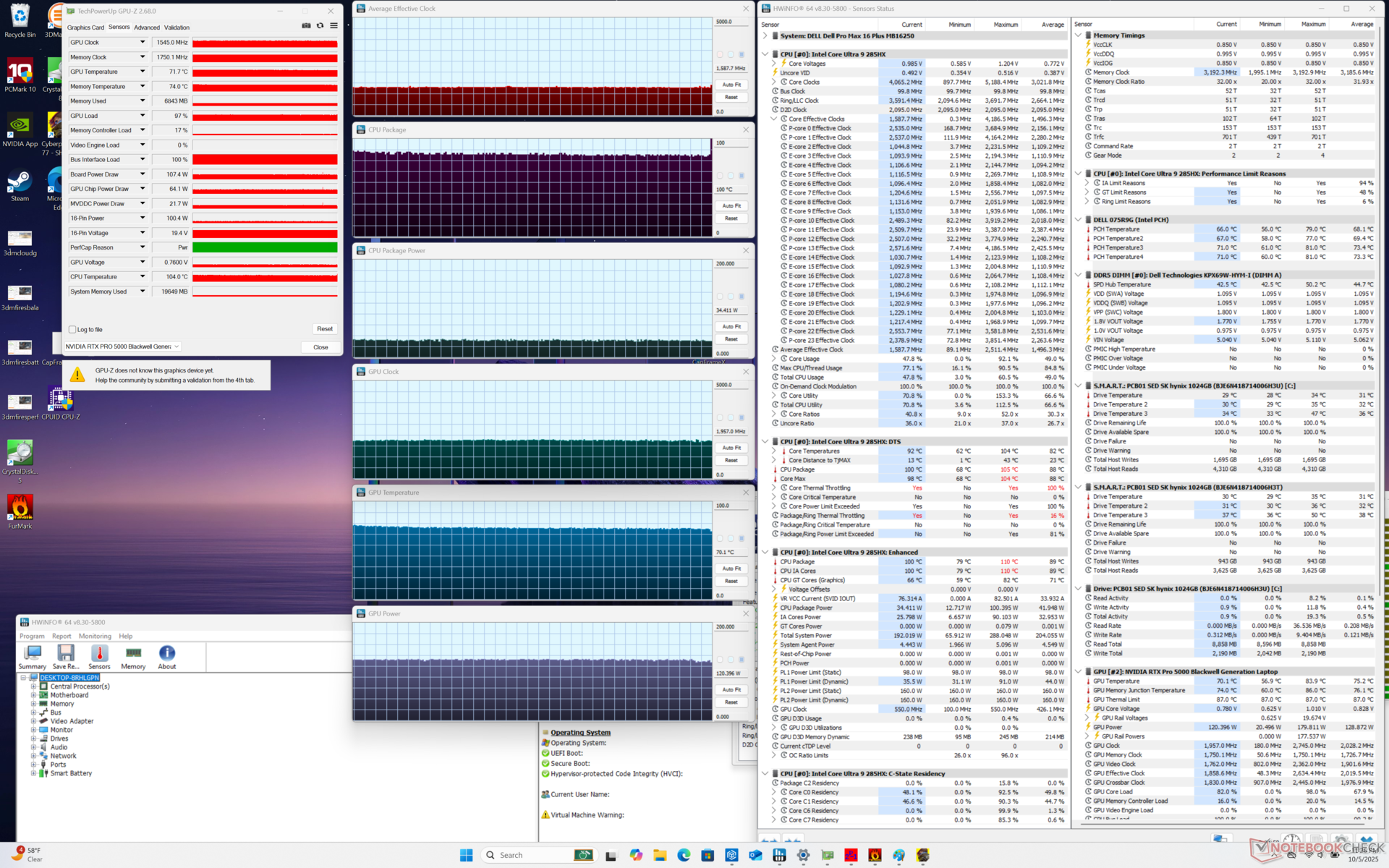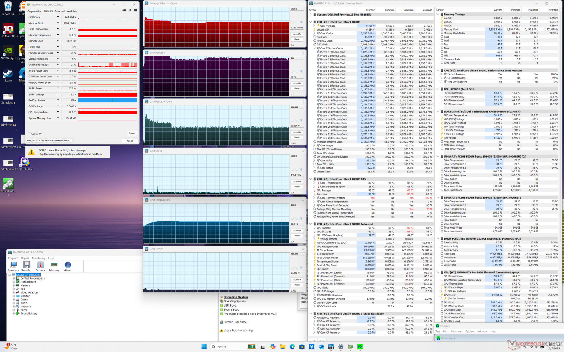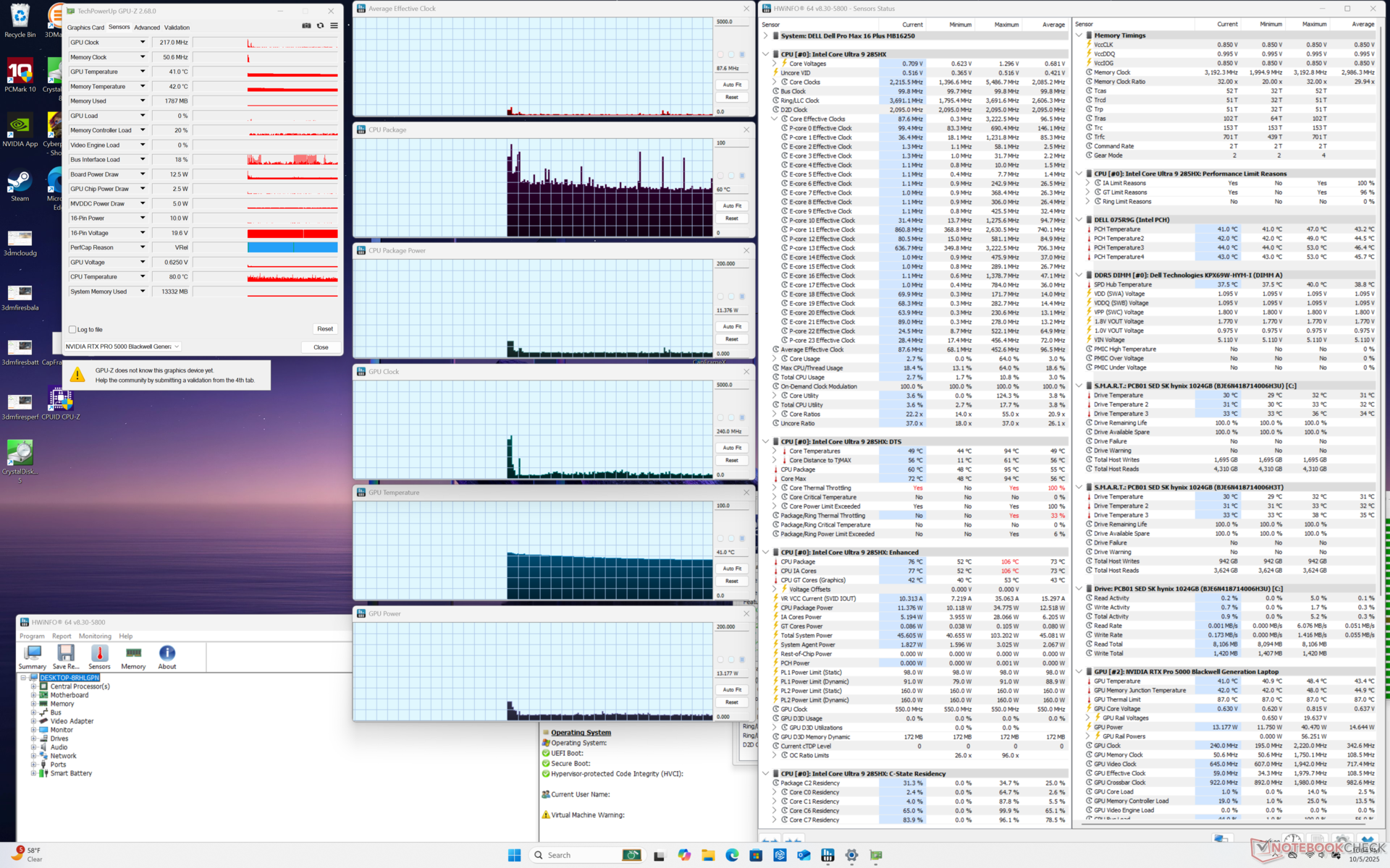 Уровень потребления ожидаемо очень высок даже в режиме простоя на рабочем столе, что способствует снижению времени автономной работы и всегда теплым поверхностям. Система заметно более требовательна к ресурсам, чем вышедший Precision 5690, но производительность выше и стабильнее, что является справедливым компромиссом.