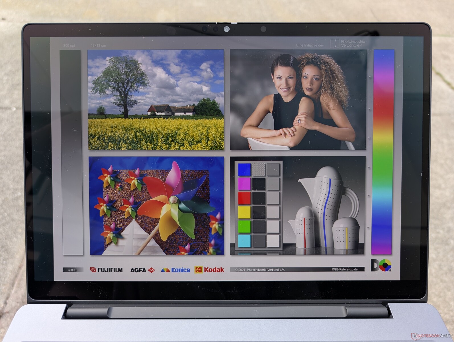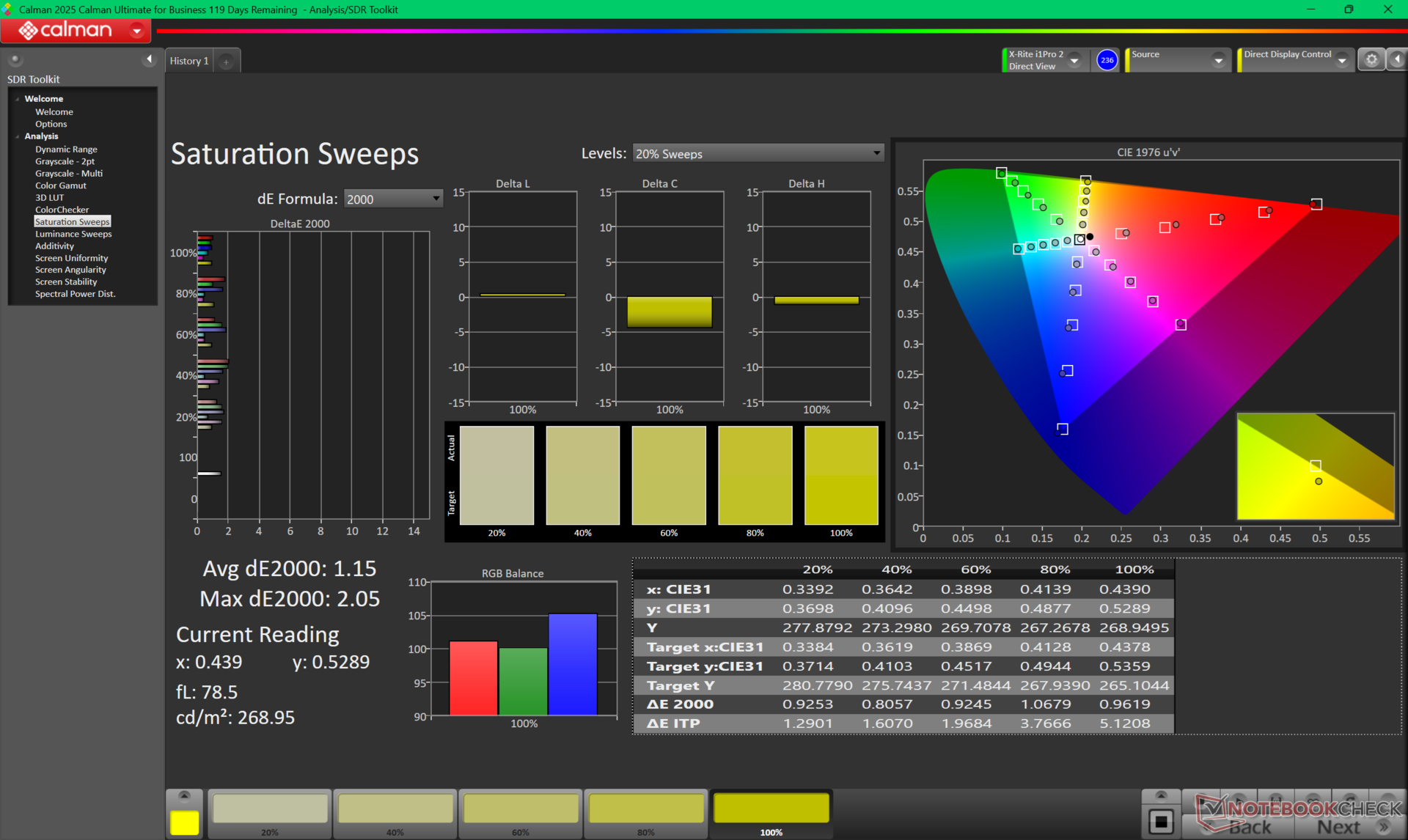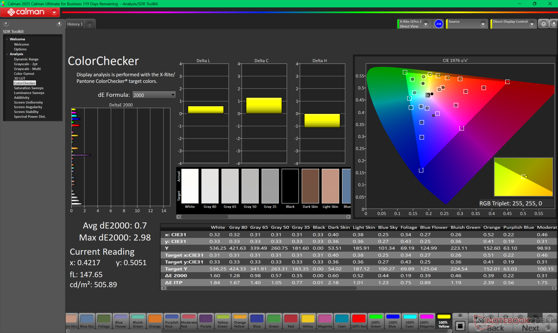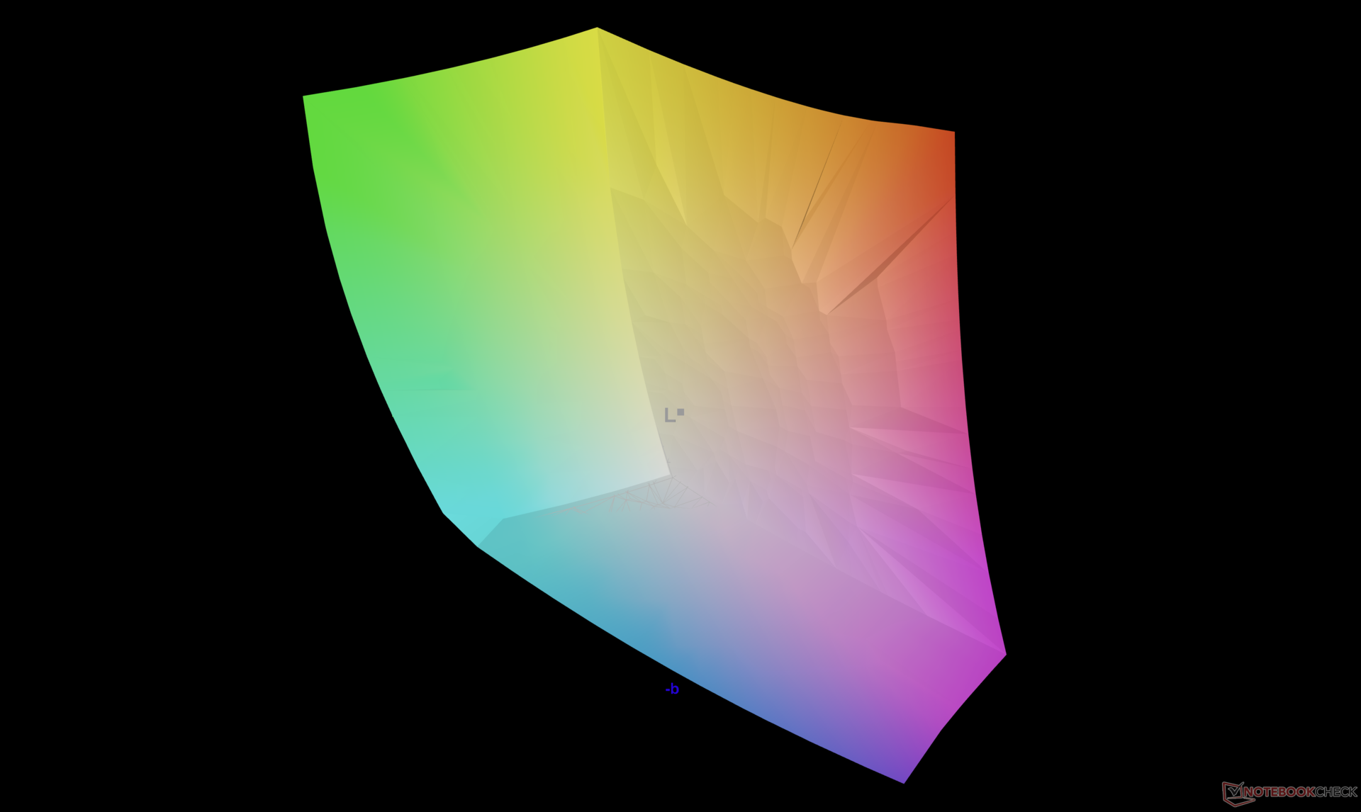 Дисплей хорошо откалиброван по стандарту P3 со средними значениями дельтаЕ для оттенков серого и цвета всего 0,8 и 2,42, соответственно.