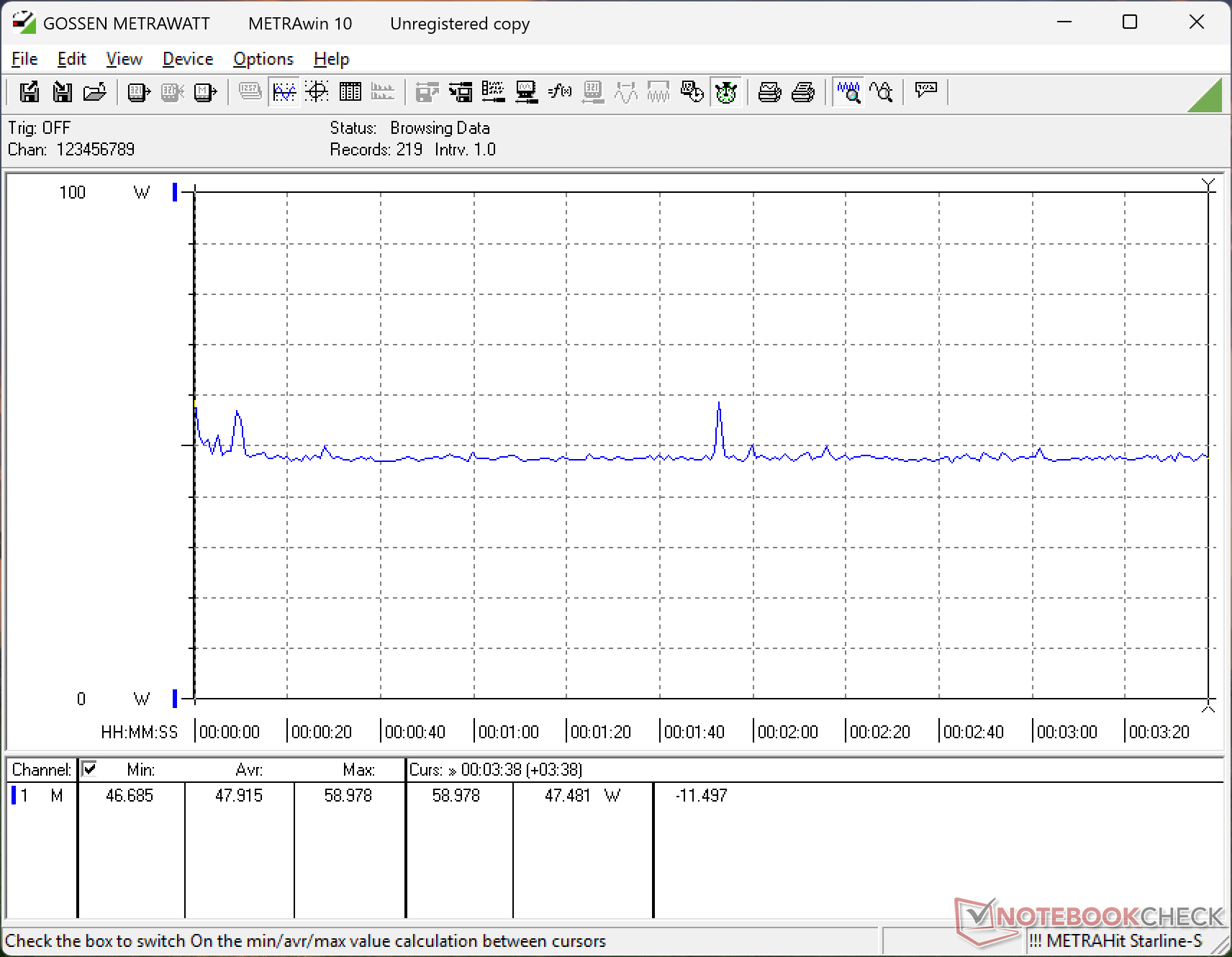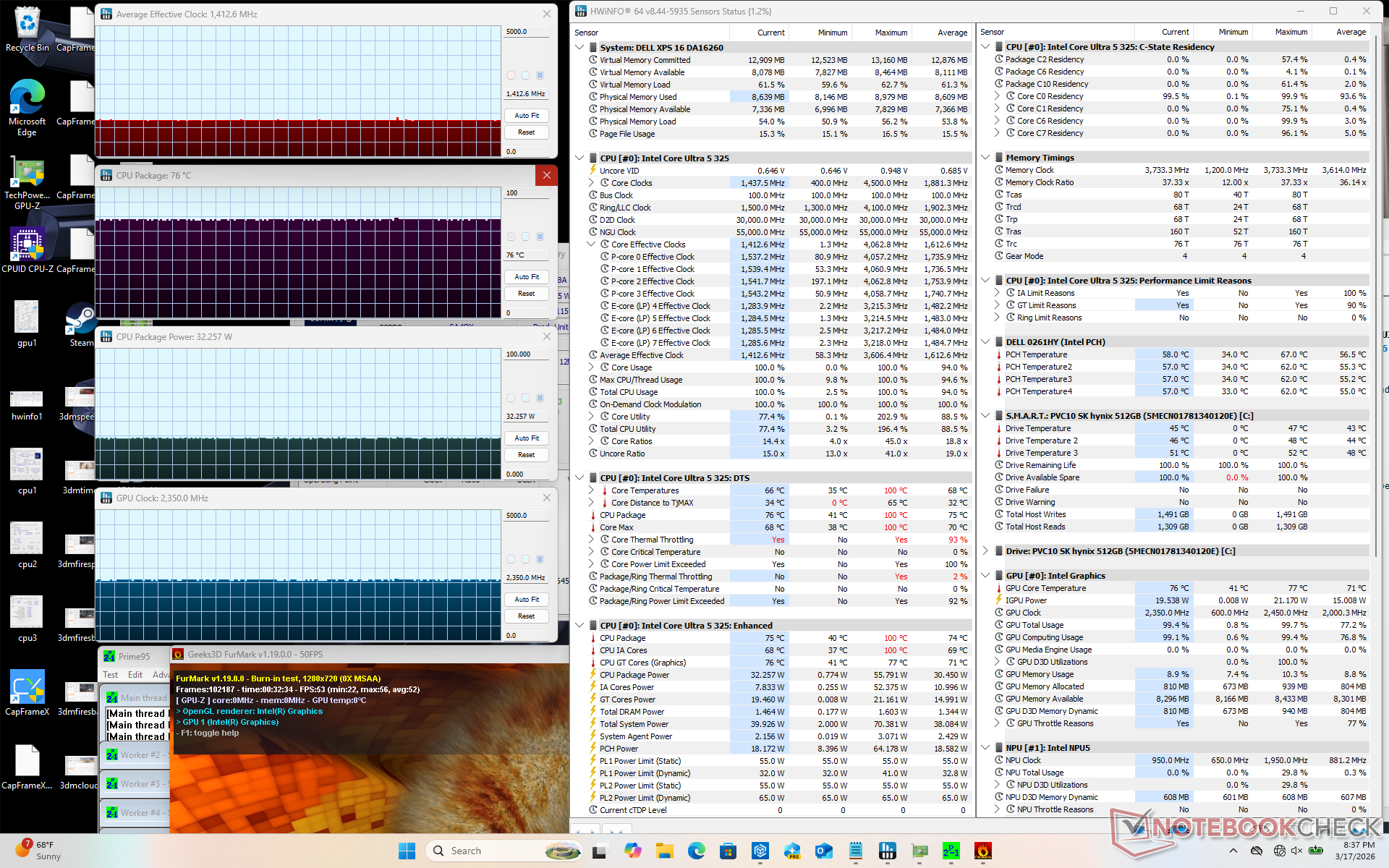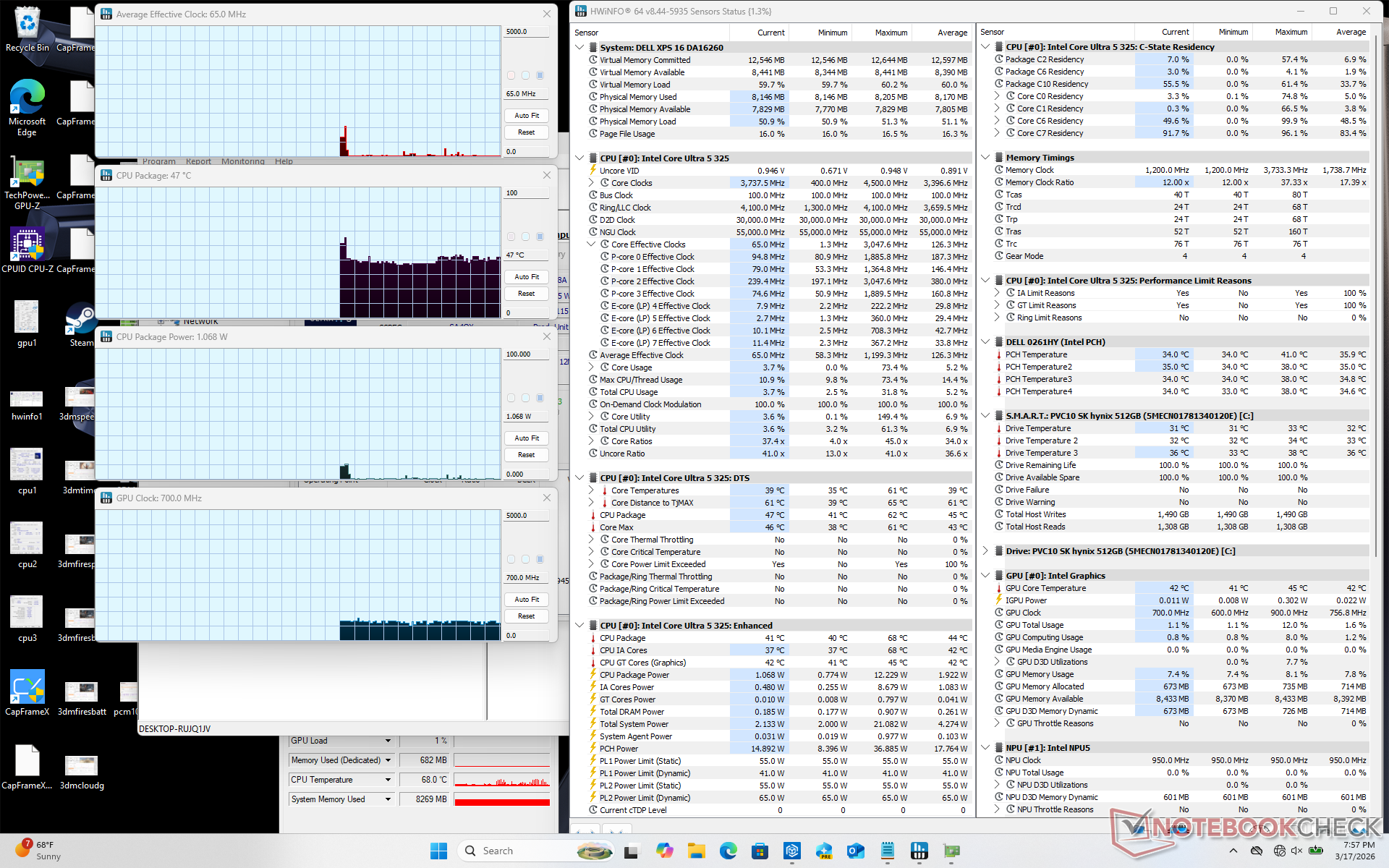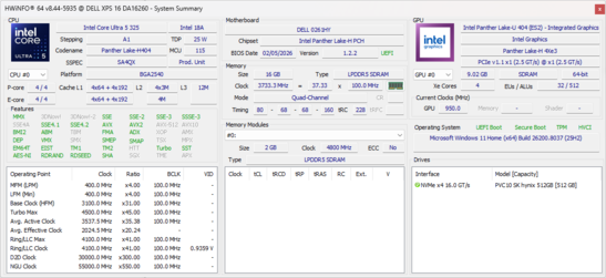 Panther Lake сочетает в себе эффективность Lunar Lake-V с высокой производительностью Arrow Lake-H, что позволяет получить лучшее из двух миров. В режиме простоя на рабочем столе при минимальной яркости потребляется всего 1,3 Вт, что чрезвычайно мало, особенно для 16-дюймового форм-фактора. При запуске игр потребление остается очень низким - чуть менее 50 Вт из-за отсутствия дискретного GPU. Если бы вместо него был установлен Core Ultra X7, то потребление в играх было бы всего на несколько ватт больше, исходя из того, что мы работали с XPS 14 что позволяет получить одни из самых высоких показателей производительности на ватт среди всех ноутбуков с iGPU.
