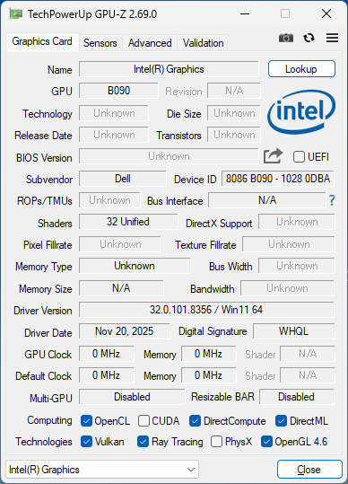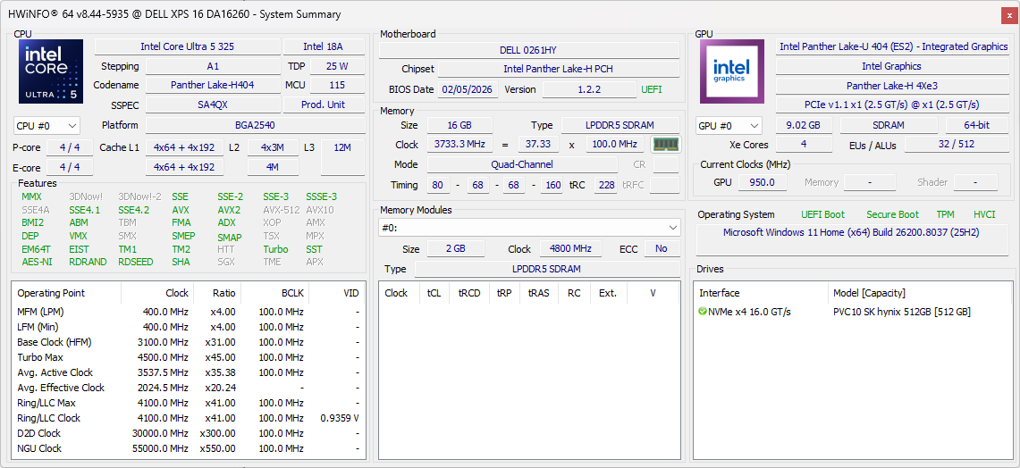 | Dell XPS 16 Core Ultra 5 325 Intel Core Ultra 5 325 ⎘ Intel Graphics 4 Xe3 Panther Lake iGPU ⎘ 16 Гбайт ОЗУ, 512 Гбайт SSD | Прейскурантная цена: 1600 USD | 1.7 килог. | 15.4 мм | 16.00" 1920x1200 142 PPI IPS | |