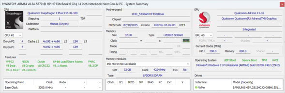 Наш тестовый EliteBook 6 G1q 14 представляет собой среднюю конфигурацию Qualcomm с процессором Snapdragon X Plus X1P-42-100, IPS-дисплеем 1200p и 32 ГБ оперативной памяти по цене около $1345 USD. Другие SKU поставляются с более медленным Snapdragon X X1-26-100 или более быстрым Snapdragon X Elite X1E-78-100, а также с дополнительными разрешениями дисплея до 1600p.