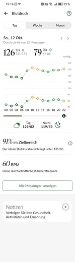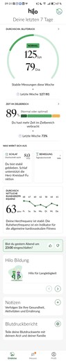 Опыт показывает, что Hilo Band измеряет артериальное давление два-три раза в час, а затем отображает среднее значение за двухчасовые блоки, а также весь диапазон измерений. Можно также просмотреть все отдельные измерения. Измерения делятся на оптимальные, нормальные, повышенные и слишком высокие. Дополнительная система цветового кодирования делает это очень наглядным. Физическая активность обычно означает, что в этот период значения не записываются.