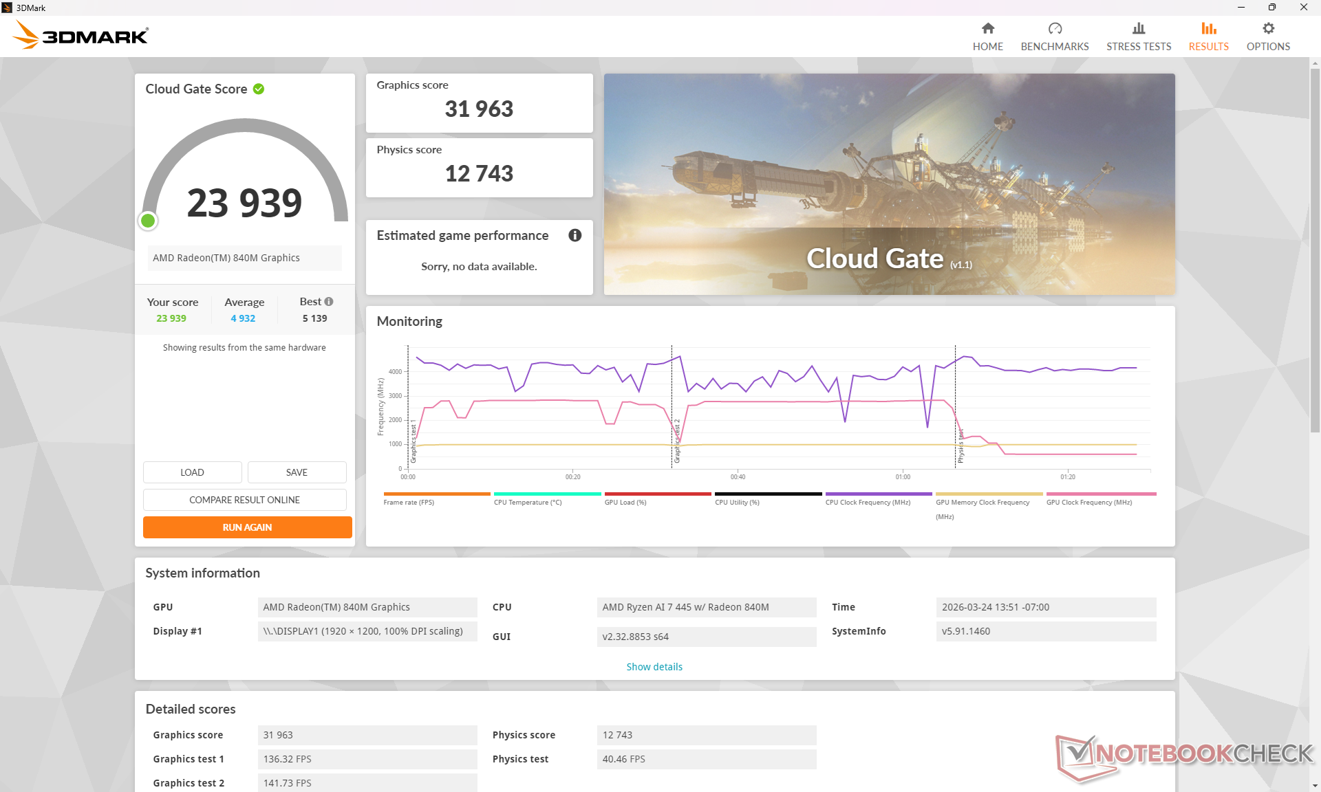 Ryzen AI 7 445 обеспечивает лишь посредственный прирост производительности примерно на 15 процентов по сравнению с Core Ultra 7 256V в прошлогодней модели Yoga 7 2-в-1 16ILL10, чтобы сравняться с недавно выпущенным Core Ultra 5 325. На самом деле, общая производительность несколько разочаровывает, поскольку она почти на 20% медленнее, чем у прошлогоднего Ryzen AI 7 350 в основном из-за меньшего количества ядер (6 против 8). По ощущениям процессор больше похож на процессор Ryzen 5 среднего уровня, несмотря на название Ryzen AI 7.