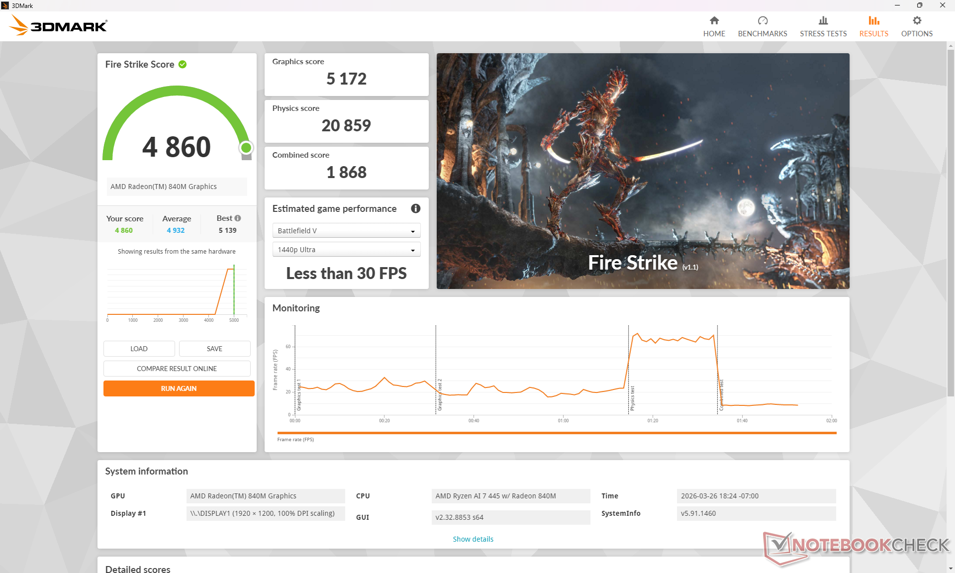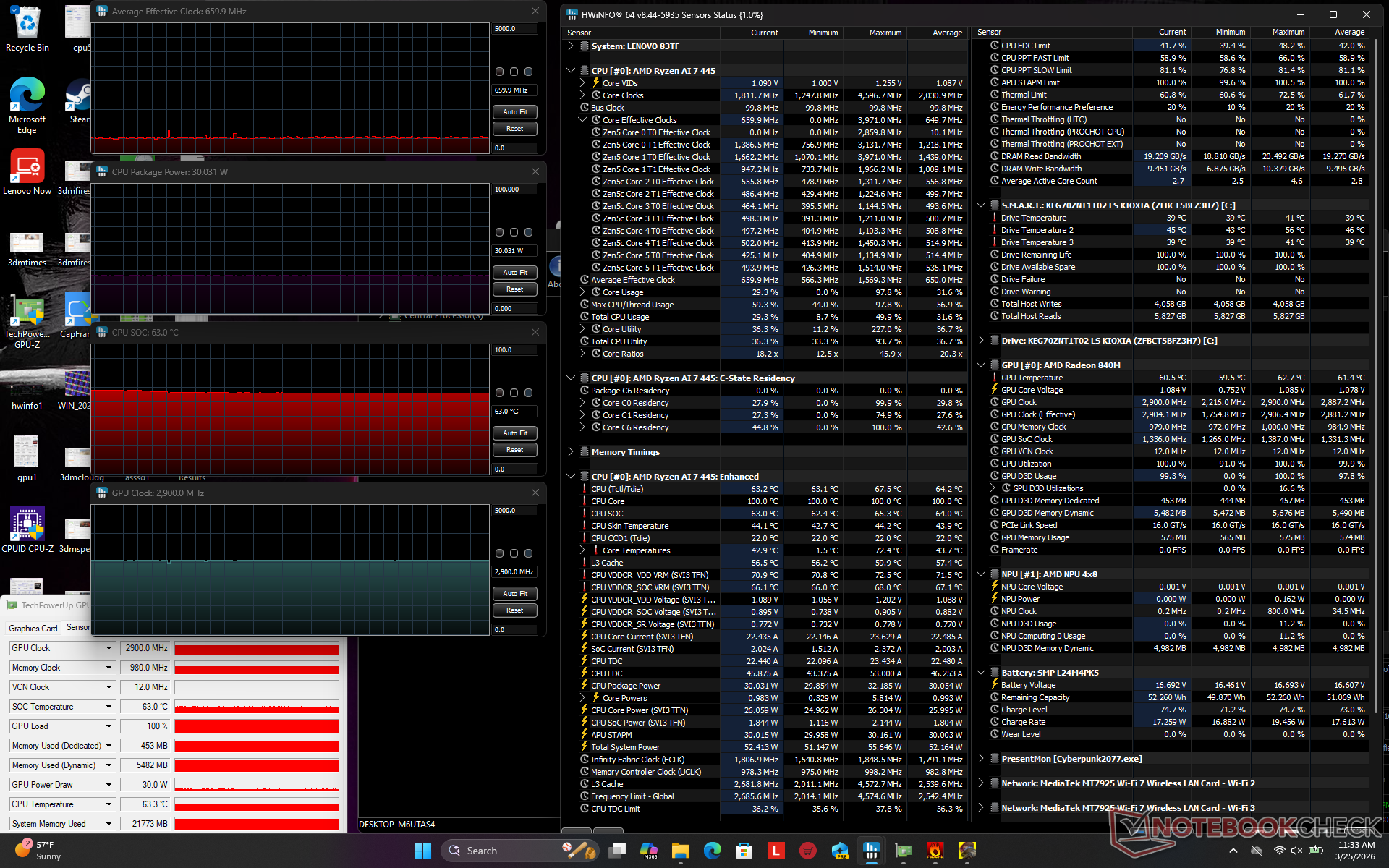 Энергоэффективность заметно хуже, чем у модели 2025 Lunar Lake-V, даже с учетом немного более высокой многопоточной производительности нашей модели AMD. Например, при запуске Prime95 наша система AMD потребует почти на 40% больше энергии при относительно небольшом 15-процентном увеличении производительности. При сравнении графической производительности преимущество еще больше склоняется в пользу Intel, поскольку наша система AMD все равно потребляет больше энергии при запуске Cyberpunk 2077, несмотря на то, что iGPU в системе Intel почти в 2,5 раза быстрее.