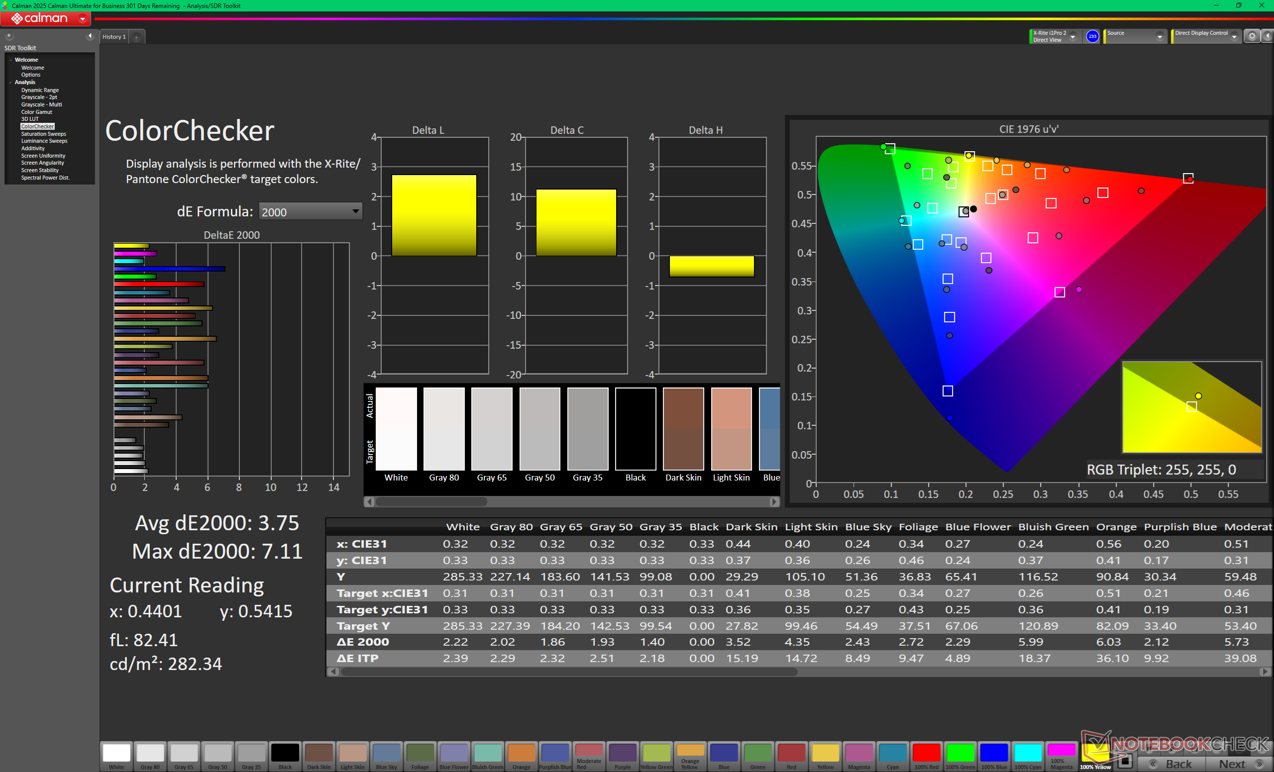 Дисплей хорошо откалиброван из коробки, особенно для модели среднего уровня. Средние значения дельтаЕ полутонов и цветов относительно стандарта P3 составляют всего 1,3 и 3,75, соответственно, поэтому дальнейшая калибровка даст лишь минимальные улучшения.