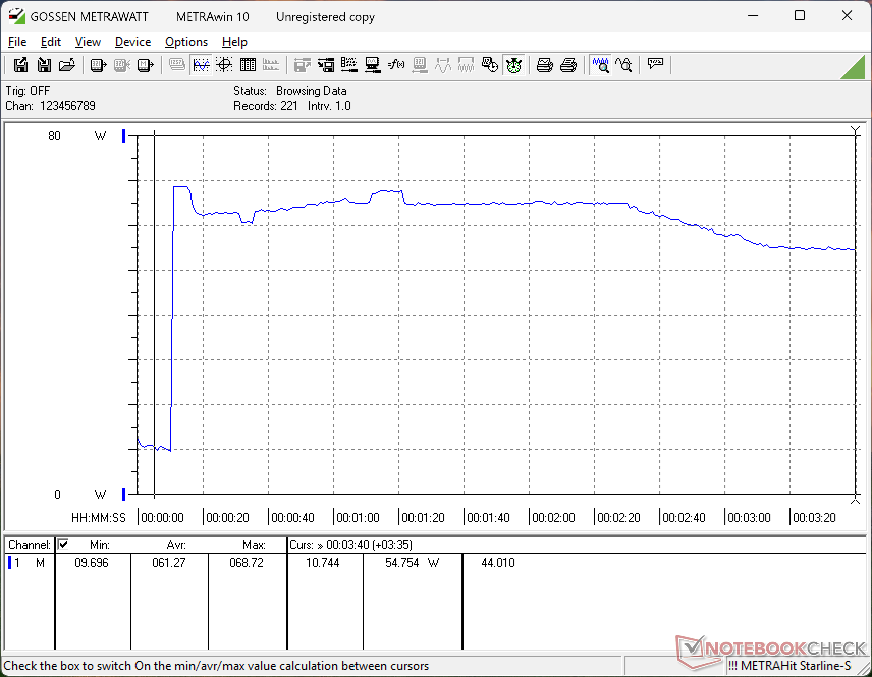 Мы смогли измерить временное максимальное потребление 69 Вт от небольшого (~5,5 x 5,5 x 2,9 см) 65-ваттного сетевого адаптера USB-C при полной нагрузке на процессор.