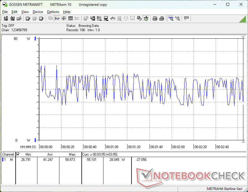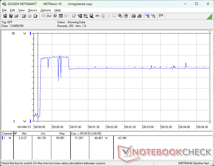 Потребление при запуске Cyberpunk 2077 колебалось между 28 и 49 Вт без видимых причин, что соответствует нашим нестабильным частотам кадров и тактовым частотам GPU, упомянутым выше.