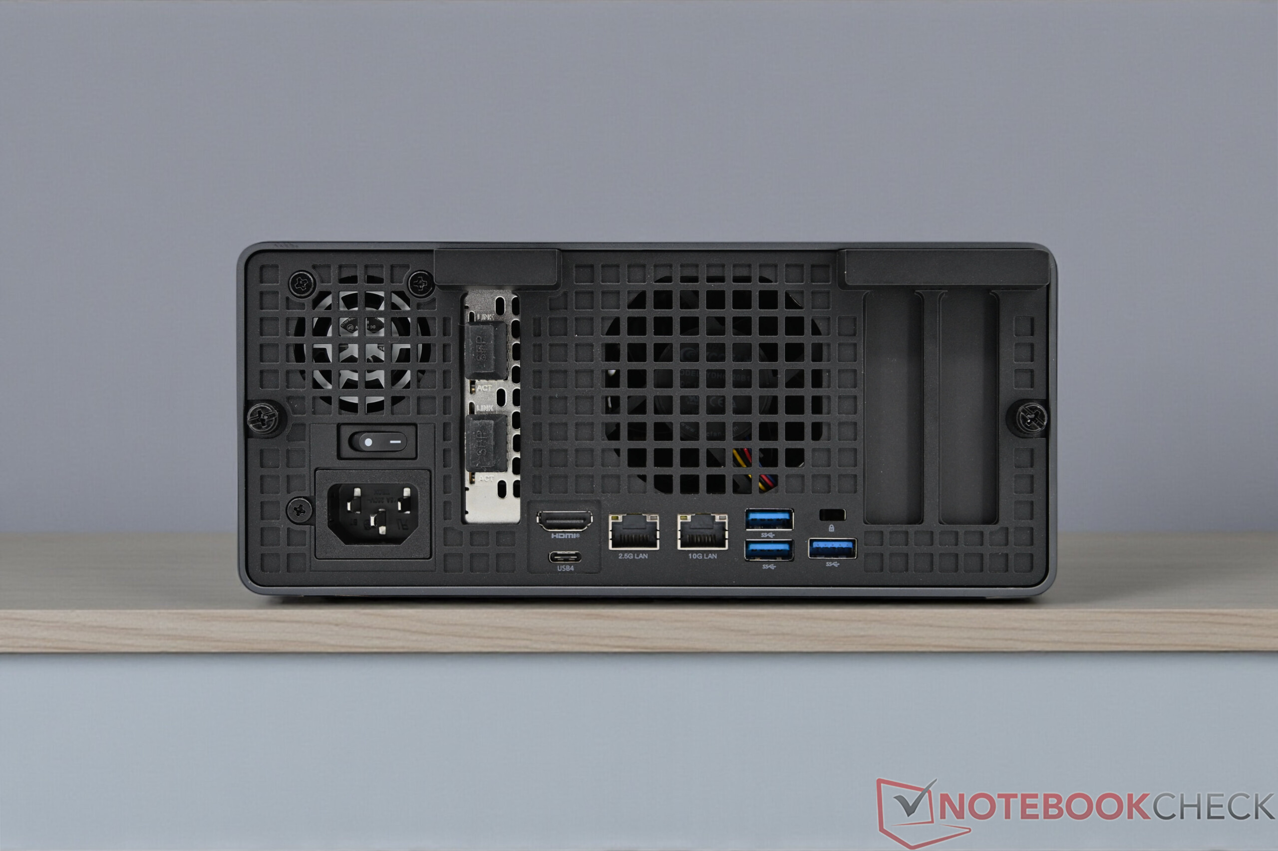 Minisforum MS-02 Ultra впечатляет высококачественным корпусом, гармонично сочетающим металл и пластик и оставляющим впечатление профессионала. Мини-ПК также очень щедро оснащен в плане подключений: несколько современных высокоскоростных портов, включая USB4 V2, обеспечивают максимальную гибкость для периферийных устройств и внешних расширений. Особого внимания заслуживает сетевое оборудование: помимо 2,5-гигабитной и 10-гигабитной локальной сети, система оснащена двумя портами SFP+, обеспечивающими скорость передачи данных до 25 Гбит/с. Компактная система также позволяет установить специализированную видеокарту в компактном формате SFF.