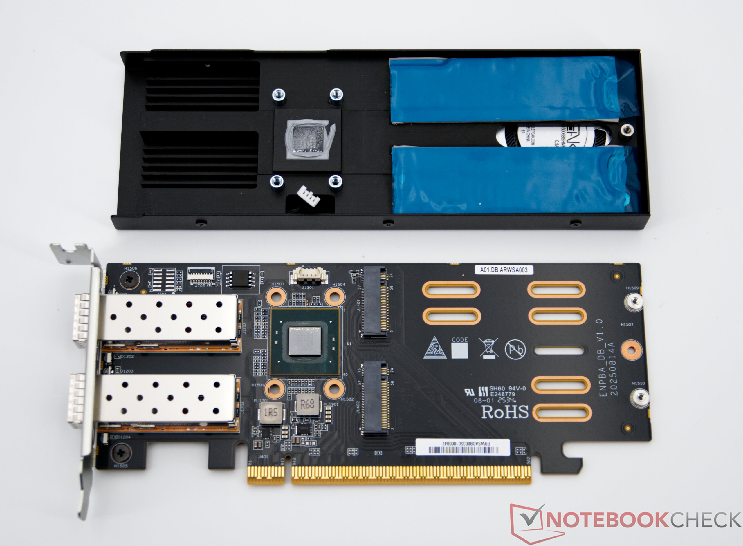 Аксессуары немногочисленны и включают в себя два кабеля (кабели подключения IEC и HDMI), а также еще один пассивный кулер для SSD, выполненный в особо плоском дизайне. Топовая модель также оснащена подключаемой картой PCIe, которая предоставляет место для двух дополнительных SSD M.2 в дополнение к двум портам SFP+. Эта карта-адаптер не входит в комплект поставки Minisforum MS-02 Ultra с процессором Intel Core Ultra 7 275HX.
