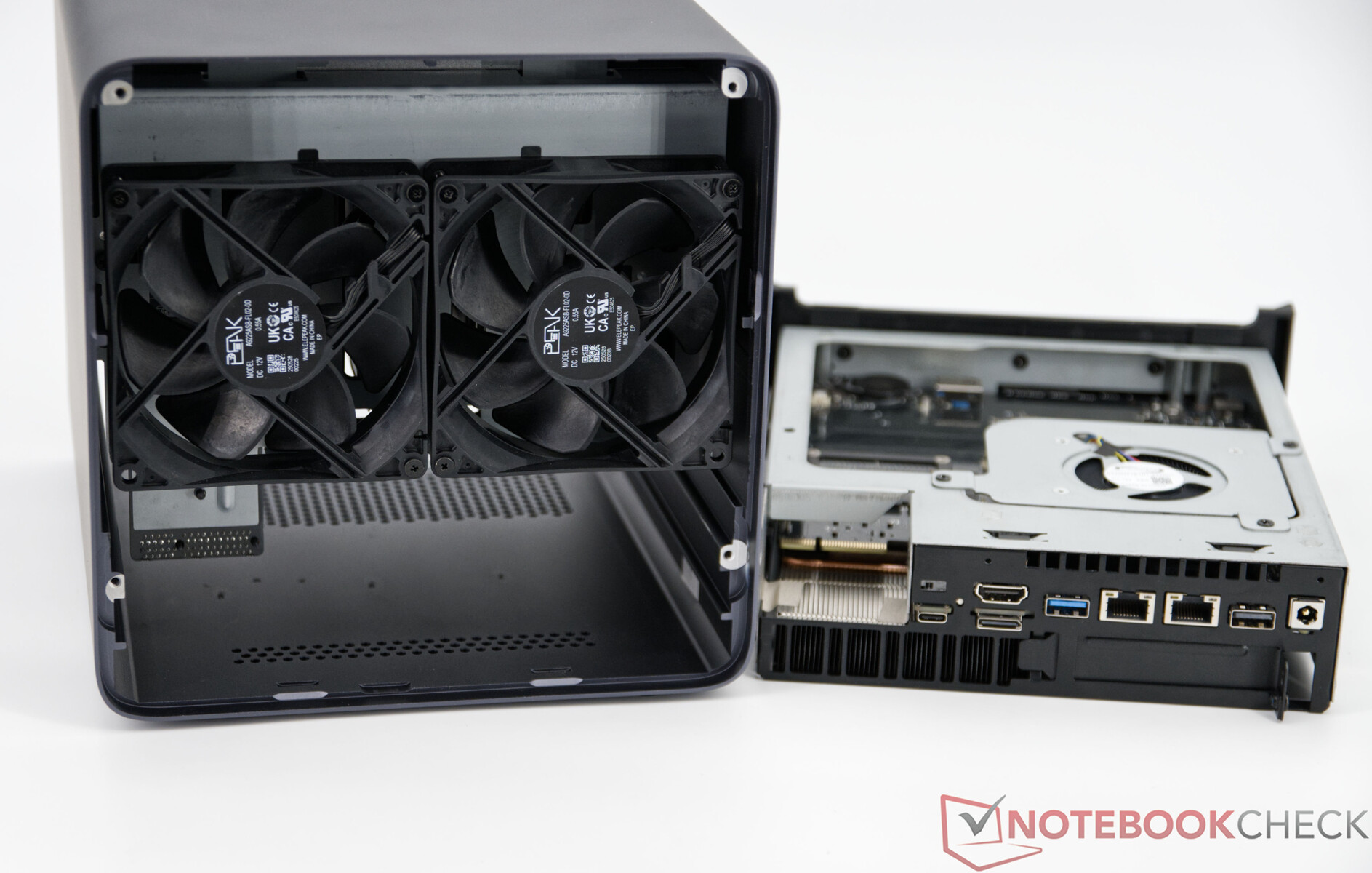 В качестве NAS-решения Minisforum N5 Pro универсален и ориентирован на практику. Два быстрых LAN-соединения (10 Гбит и 5 Гбит) обеспечивают быстрое подключение к сети, а модульная конструкция облегчает техническое обслуживание. Пять отсеков для жестких дисков можно заменить без инструментов, а доступ к внутренней базе Mini-PC также осуществляется всего за несколько простых шагов. Несмотря на компактный дизайн, система охлаждения остается эффективной: даже при постоянной нагрузке температура остается низкой, а вентиляторы не шумят.