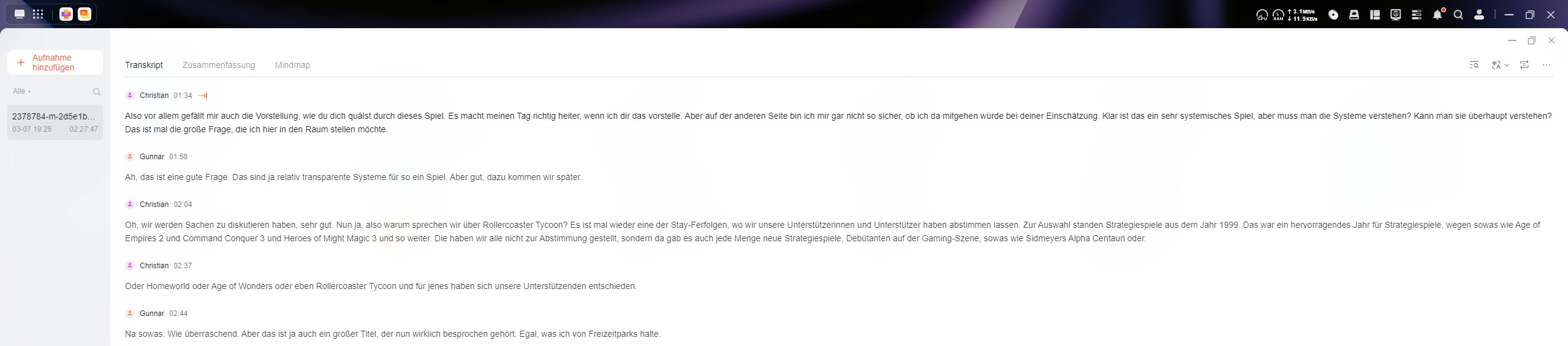 С помощью приложения аудиофайлы можно расшифровывать и обобщать. Мы подробно оценили эту функцию на примере эпизода 161 подкаста Stay Forever. Эпизод подкаста длится чуть менее 2 часов 30 минут, а расшифровка заняла 10 минут. Транскрипт очень удобен для использования. Длинные монологи иногда разбиваются на две отдельные записи, но это совершенно безвредно. Есть незначительные отклонения; например, одна фраза была распознана неверно, вместо правильной формулировки. Распознавание диктора работает надежно, и как имена дикторов, так и сам транскрипт можно редактировать. При нажатии на соответствующий текст воспроизводится соответствующий раздел. В целом, пользовательский опыт очень хорош. Стенограмму можно экспортировать в виде отформатированного документа DOCX. Можно также составить резюме и даже создать карту ума.