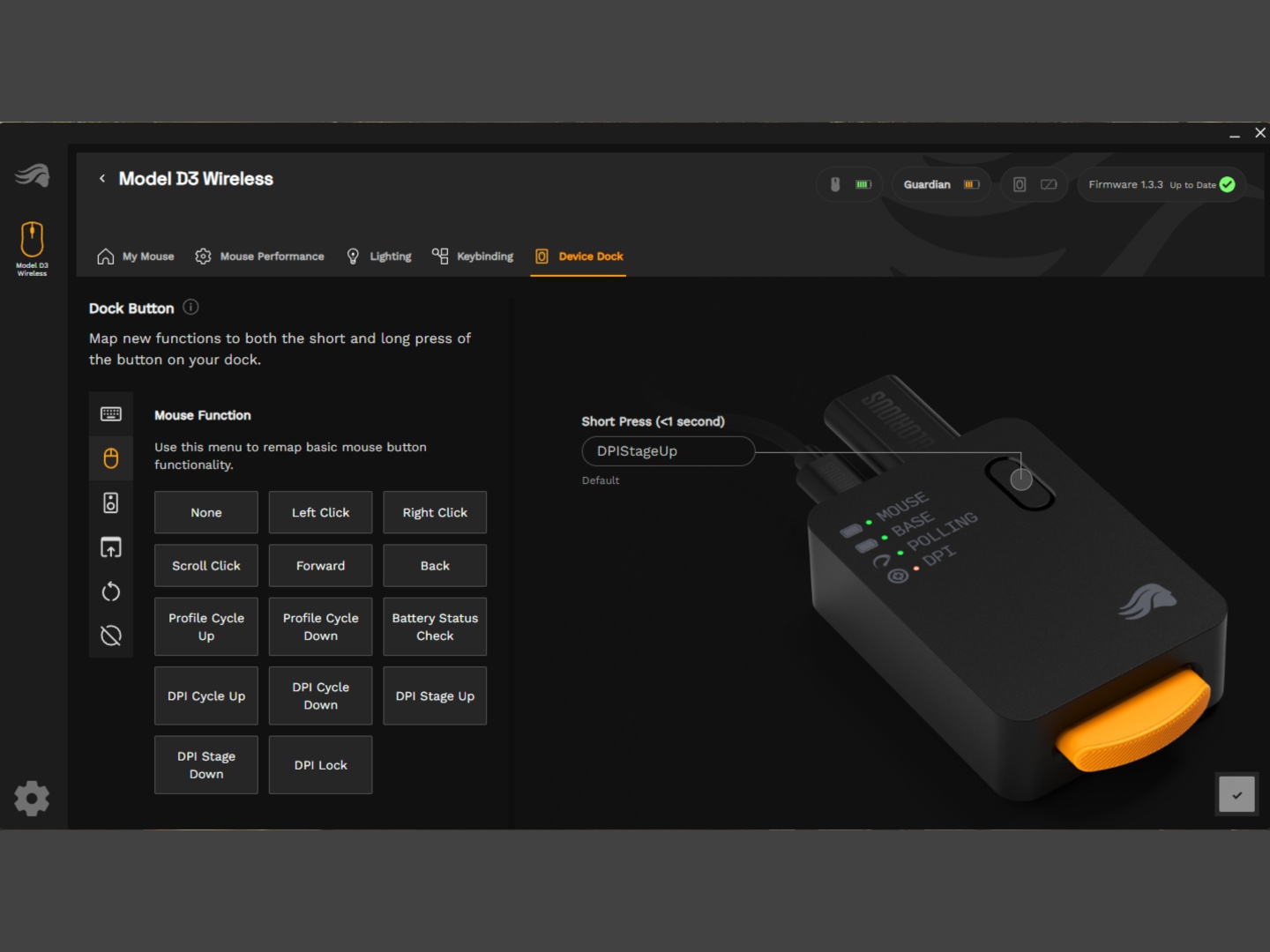 База выполняет функции станции подключения и зарядки. На ней не только размещается донгл 2,4 ГГц, но и имеется гнездо для зарядки запасного аккумулятора. Кроме того, здесь есть четыре светодиодных индикатора для контроля уровня заряда батареи мыши, запасной батареи, а также частоты опроса и DPI. Glorious добавила на основание кнопку, которую можно настроить с помощью программного обеспечения Core. Она может использоваться для запуска приложений или выполнения макросов, что довольно здорово.