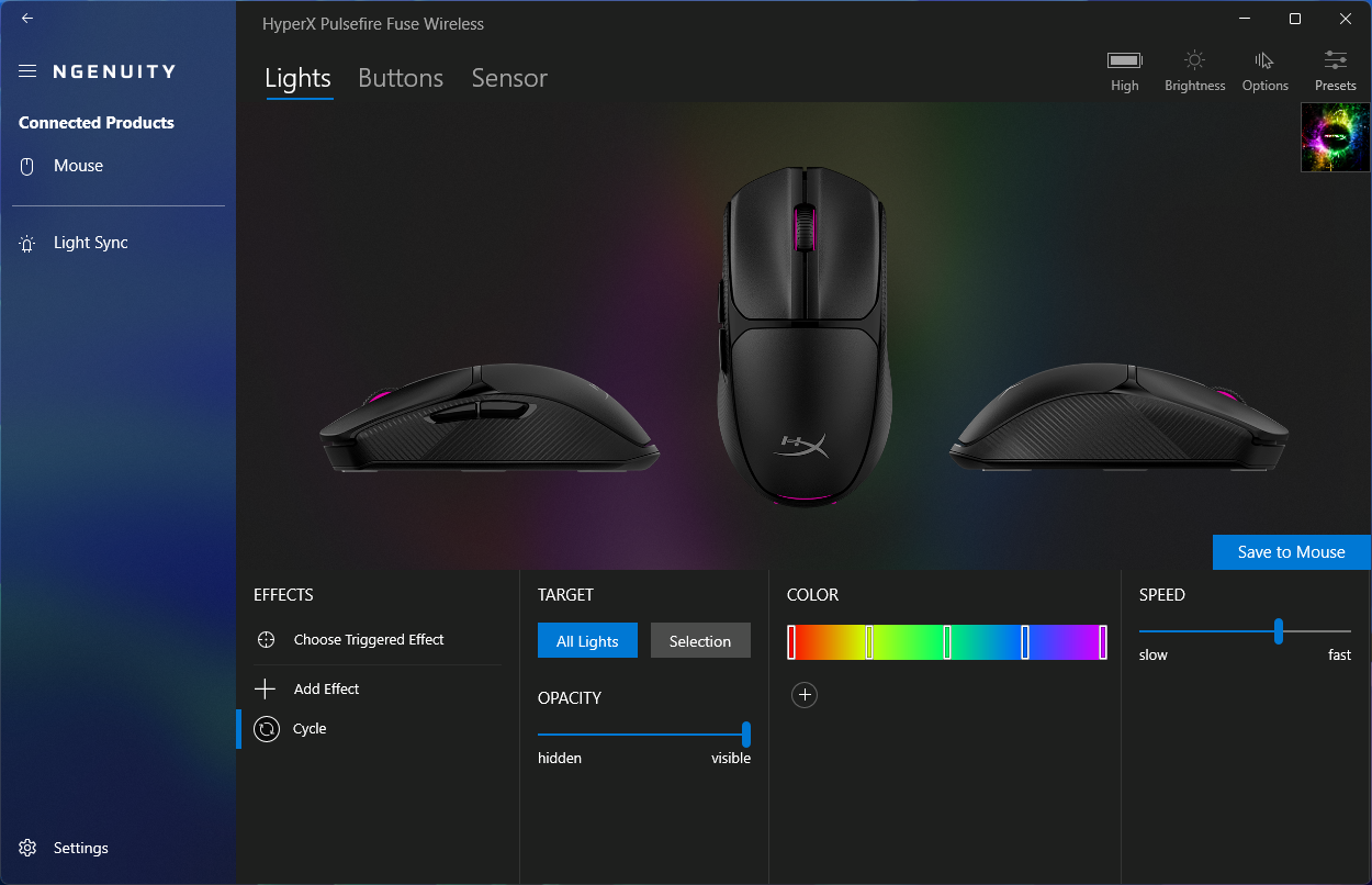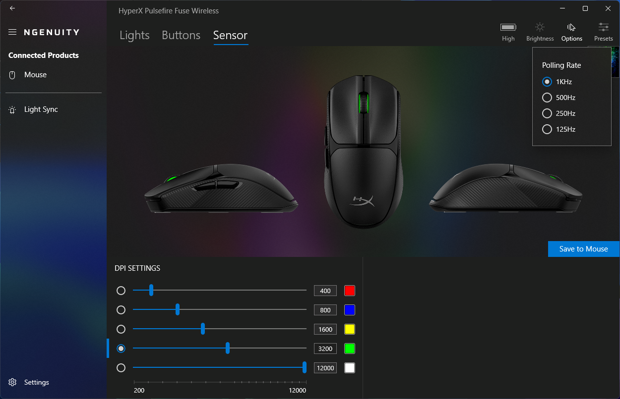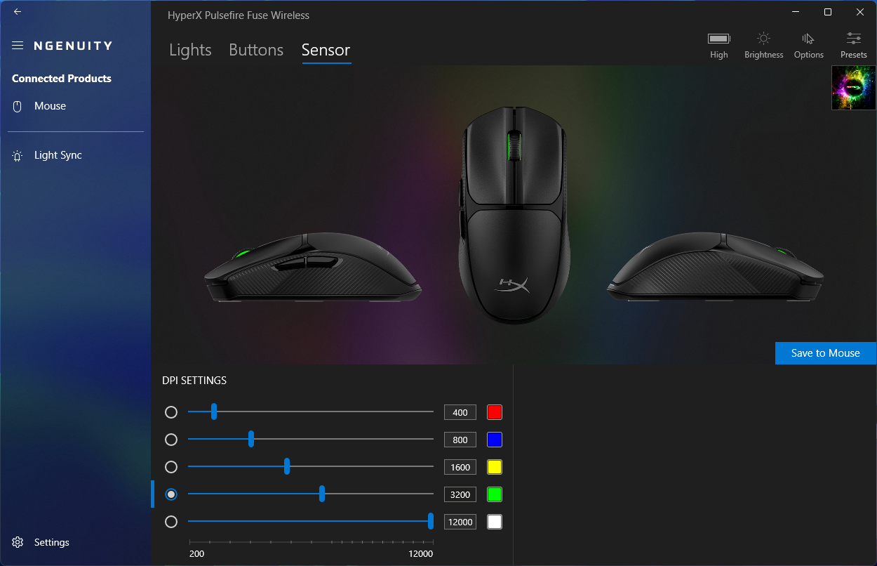Pulsefire Fuse Wireless работает "из коробки", не требуя дополнительного программного обеспечения. Для тех, кто хочет получить больше контроля, HyperX Ngenuity приложение предлагает настройку RGB и синхронизацию устройств HyperX, переключение кнопок, регулировку частоты опроса, до пяти пользовательских режимов DPI и одно встроенное хранилище предустановок.